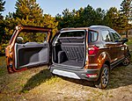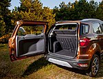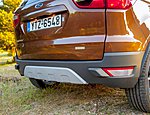 Αισθητικά δεν περνά απαρατήρητο για πολλούς λόγους. Πρώτον, είναι και δείχνει συμπαγές. Δεύτερον, με τη μεγάλη υπερυψωμένη του μάσκα, φουλ επενδεδυμένη με λωρίδες χρωμίου, τα στενά, αλά Mondeo φωτιστικά εμπρός αλλά και το ακραία κεκλιμένο του παρμπρίζ δεν μοιάζει με τίποτε άλλο εκεί έξω, θυμίζοντας κάπου κάπου ένα Edge σε σμίκρυνση. Στο δε πίσω μέρος, καινοφανής για τη Ford είναι ο τρόπος ανοίγματος της πόρτας του χώρου αποσκευών, ο οποίος ανοίγει στο πλάι. Είναι κατάλοιπο αυτό της αρχικής υλοποίησης που ήθελε το EcoSport να διαθέτει στάνταρ εφεδρικό τροχό αναρτημένο εξωτερικά, όπως πλείστα SUV του παρελθόντος (διατίθεται ακόμη ως προαιρετικό στοιχείο εξοπλισμού κι εμείς το προτείνουμε ως επιλογή). Η σχεδίαση εδώ στα μετόπισθεν θυμίζει κάτι από τις οικογένειες «MAX» της Ford με τα φινιστρίνια, τα φωτιστικά σώματα και τη συνολική αισθητική, κάτι που σαφώς λογίζεται στα θετικά του μοντέλου, θέλοντας να έχει συνοχή με την ταυτότητα της Ford.