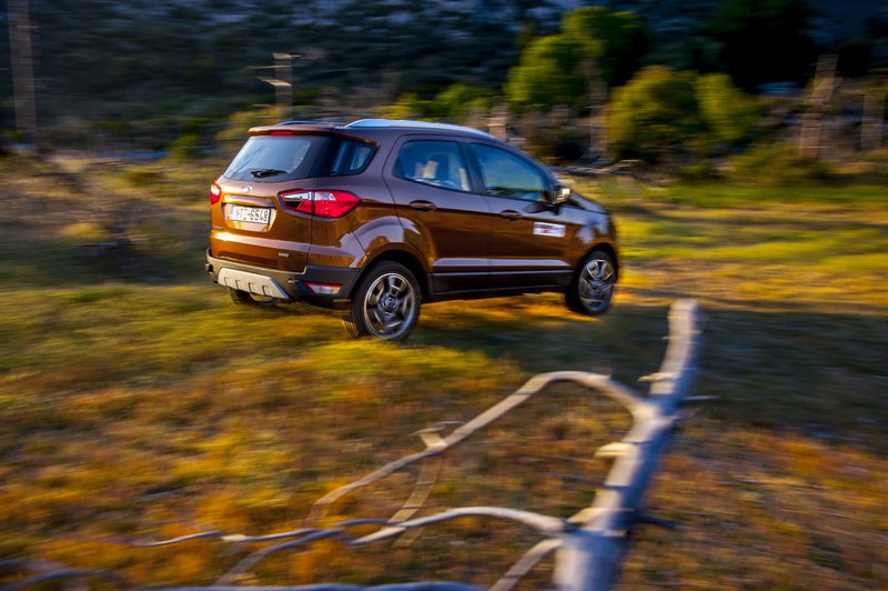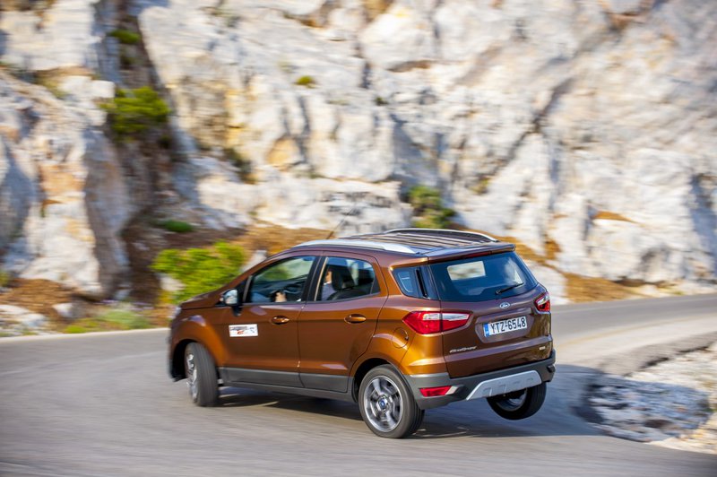 Με άλλα λόγια, έναν από τους ισχυρότερους κινητήρες παγκοσμίως, καθώς από τα 999 τρικύλινδρα υπερτροφοδοτούμενα κυβικά του (επιπλέον Twin-independent Variable Cam Timing -Ti-VCT και τεχνολογία άμεσου ψεκασμού), παράγονται 140 ίπποι και 180 Nm ροπής (20 λιγότερα από το hot Fiesta). Είναι λίγο ράθυμος χαμηλά, μέχρι τις 2.500 rpm. Ακολούθως βεβαίως ο δείκτης του στροφόμετρου ανεβαίνει αγόγγυστα και φτάνει μέχρι τις 6.500 rpm του κόφτη, δίνοντας έναν ικανοποιητικό ρυθμό κίνησης. Θα ήταν ακόμα πιο αλέγρος αν το βάρος του EcoSport ήταν μικρότερο και το κιβώτιο ήταν 6άρι και όχι 5άρι, καθώς η κλιμάκωση έχει κάποια «κενά», με αποτέλεσμα να «πνίγονται» οι επιδόσεις. Στον αυτοκινητόδρομο δεν θα δυσκολευτεί να κινηθεί με χαμηλό επίπεδο θορύβου σε νομοταγείς ταχύτητες -χάρη στην πολύ φροντισμένη ηχομόνωσή του- με μόνη υποψία... ηχορύπανσης προερχόμενη από την κύλιση των ελαστικών τα οποία, παρ' όλα αυτά είναι πολύ ήσυχα. Με σταθερό τέμπο εδώ θα δείτε στη μικρή οθόνη πολλαπλών ενδείξεων κάτι περισσότερο από 7 l/100km. Αν βεβαίως γίνετε πιο θρασείς με το δεξί πεντάλ, ο μικρός και ήσυχος σε λειτουργία τρικύλινδρος κινητήρας δεν θα σας το... συγχωρήσει με κατανάλωση πέριξ των 10 l/100km. Και πάμε στο διά ταύτα...