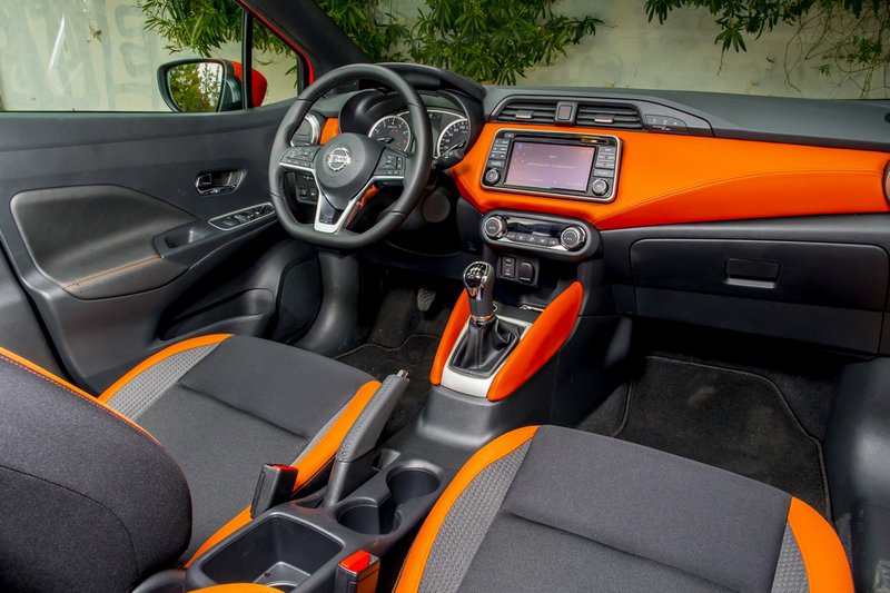 Στο Micra, το εσωτερικό του είναι σχεδιασμένο με παρόμοια «φιλοσοφία», με τις γραμμές του ταμπλό να είναι έντονες και να διαμορφώνουν προεξέχουσες επιφάνειες. Στο κέντρο του υπάρχει η οθόνη αφής, ενώ στο συγκεκριμένο επίπεδο εξοπλισμού η διχρωμία το κάνει πιο «φωτεινό» σε σύγκριση με ό,τι ισχύει στο εσωτερικό του 208. Το Nissan είναι ευρύ εσωτερικά και σε αυτό τον τομέα σού δίνει την αίσθηση ότι βρίσκεσαι σε μεγαλύτερο όχημα. Ομως το ωφέλιμο μήκος για τους επιβάτες είναι μικρότερο από αυτό του Peugeot, ιδίως για τους πίσω. Οσοι μεταφέρονται εκεί έχουν και μικρότερο ωφέλιμο ύψος, λόγω της σχεδίασης του αμαξώματος. Πάντως τέσσερις ενήλικοι θα χωρέσουν στο καινούργιο Micra χωρίς ιδιαίτερο πρόβλημα. Η ποιότητα κατασκευής και υλικών είναι καλύτερη στο Nissan, το οποίο -προς το παρόν- διακρίνεται σε όλη την κατηγορία σε αυτό τον τομέα.