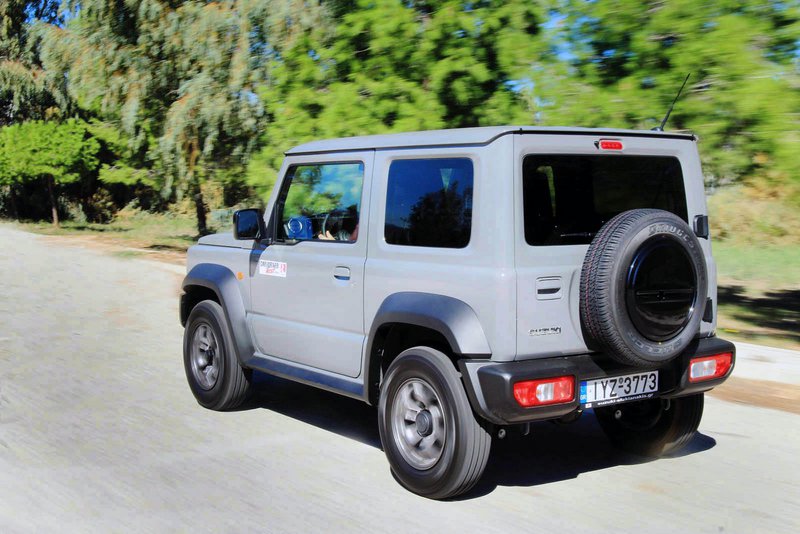 Και από την άλλη, η γωνία προσέγγισης 37 μοιρών, η γωνία ράμπας 28 μοιρών και η γωνία διαφυγής 49 μοιρών αλλά και η απόσταση των 21 εκατοστών του πλαισίου από το έδαφος κάνουν το Jimny έναν γνήσιο trekker. Δε δυσκολεύεται να περάσει εμπόδια, να «καταπιεί» λακκούβες, να υπερκεράσει ένα χωμάτινο στίβο με άνεση και μεγάλη σιγουριά, μέχρι και να ντριφτάρει στο χώμα. Mέρος γι αυτή την ικανότητα πρέπει να αποδοθεί και στα ελαστικά Dueler H/T της Bridgestone με διάσταση 195/80-R15. Εδώ στο χώμα είναι που νιώθει «σα στο σπίτι του» κι αυτό είναι κάτι που επιβεβαιώνεται από το μηχανολογικό του background. Άλλο ένα σημαντικό στοιχείο είναι ότι η κατανάλωση τις ημέρες δοκιμής διατηρήθηκε στα 7,9 l/100km.