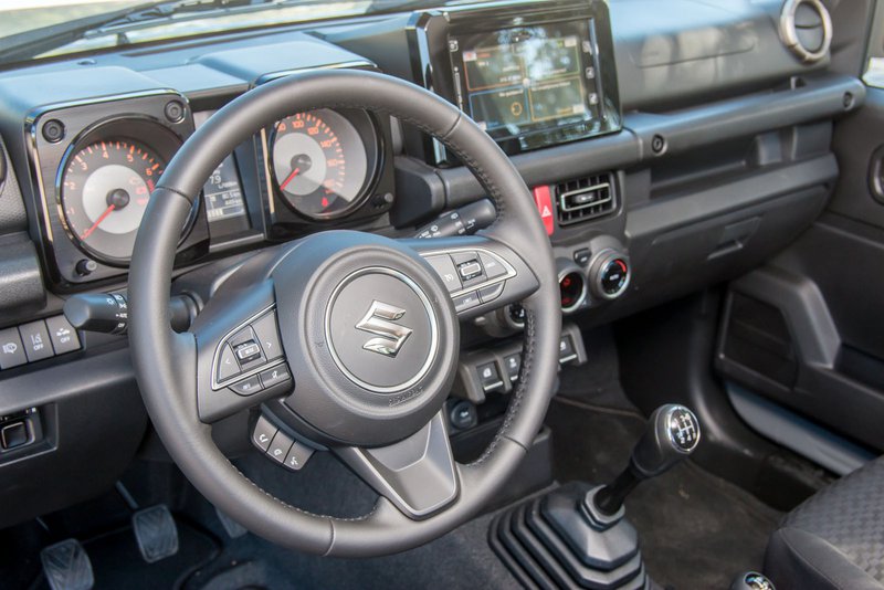 Το ίδιο και στο εσωτερικό με το λιλιπούτειο ταμπλό, τις αλενόβιδες και το σαγρέ σκληρό πλαστικό που βρίσκει κανείς σε…δραπανοκατσάβιδα. Είναι όμως αυτή η προσέγγιση που δημιουργεί την εικόνα του στιβαρού κι αυτό το πετυχαίνει 100%. Οι χώροι, τα καθίσματα εμπρός-πίσω είναι σίγουρα για την κάτω κλίμακα των σωματότυπων. Υπάρχει πάντως μια υποτυπώδης αίσθηση πρακτικότητας με κάποιες θέσεις για μικροαντικείμενα. Ας κάνουμε την πρόταση στη Suzuki για επιμήκυνση του πατώματος τύπου «σκάλα» για ένα μελλοντικό, πεντάθυρο Jimny. Η πλέον εμφανής διασύνδεση του παρελθόντος με το τεχνολογικό παρόν της Suzuki είναι οι διακόπτες αριστερά και δεξιά του τιμονιού για τα συστήματα ασφαλείας.