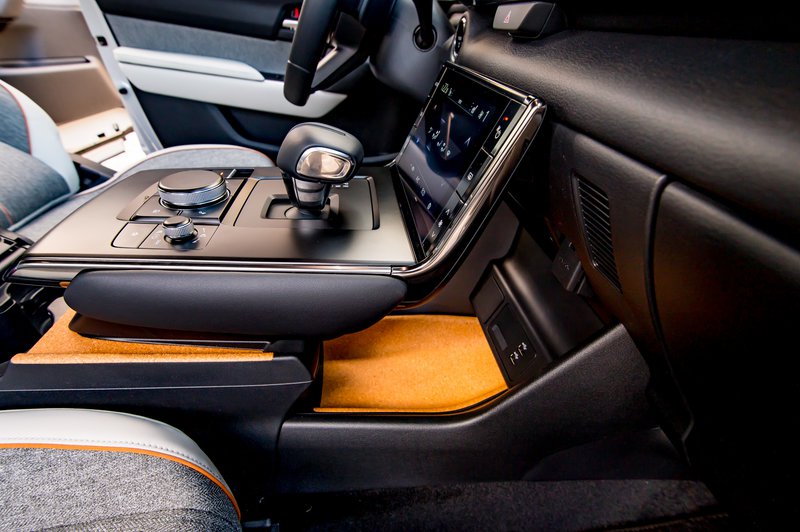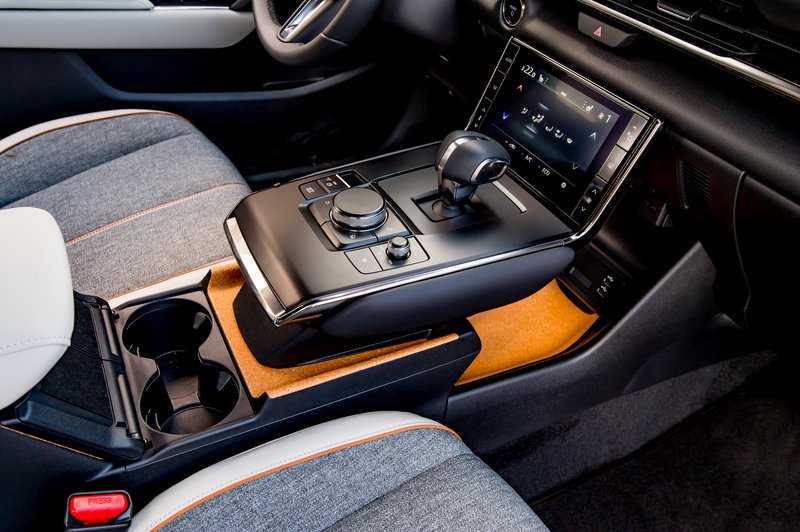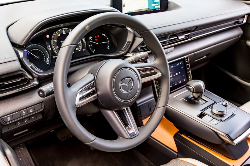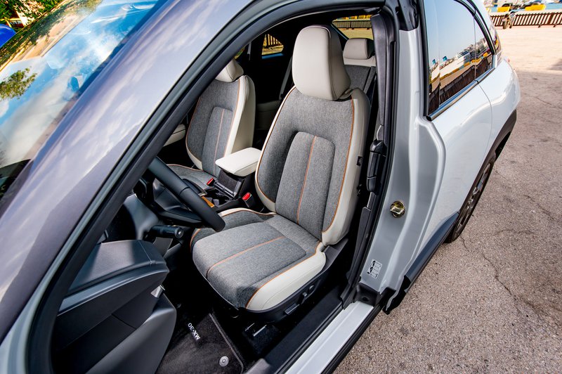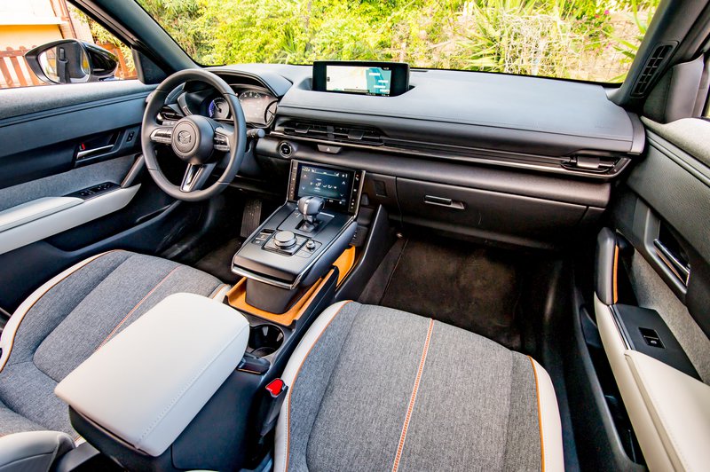 Εάν τώρα απολαμβάνετε συνήθως μοναχός (άντε και με ένα συνοδηγό) τη διαδικασία της μετακίνησης, τότε το MX-30 δείχνει να παίρνει κεφάλι. Εδώ η διαφορά στην πρώτη εικόνα είναι χαοτική. Οι Ιάπωνες έχουν παίξει τα ρέστα τους στο design, δημιουργώντας μία ψευδαίσθηση αιώρησης στη βάση της κεντρικής κονσόλας. Κατόπιν, συμπληρώνουν το εσωτερικό με προσεγμένα και ιδιαίτερα υλικά, όπως δέρμα, ανακυκλωμένα πλαστικά υψηλής ποιότητας και φελλό.