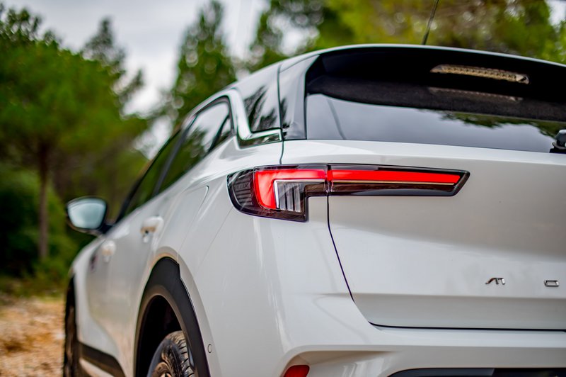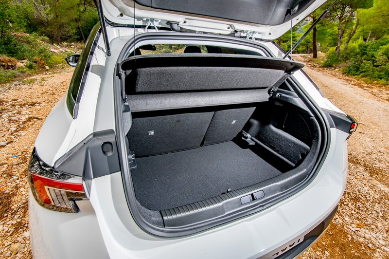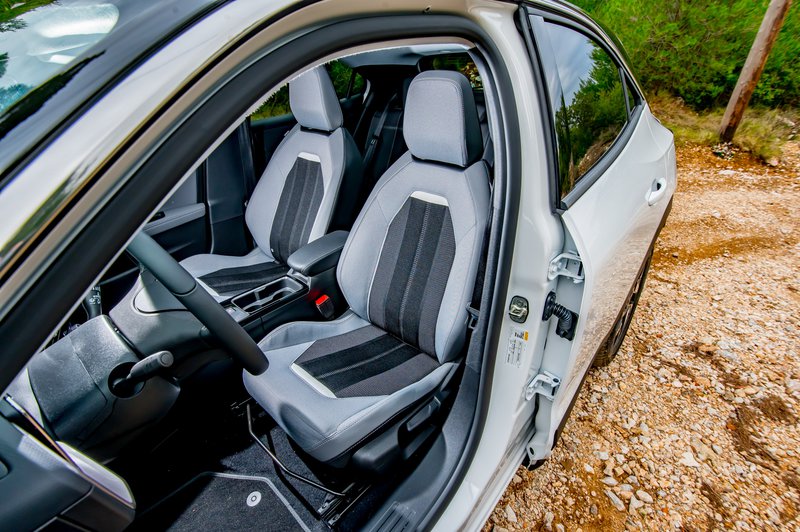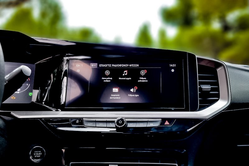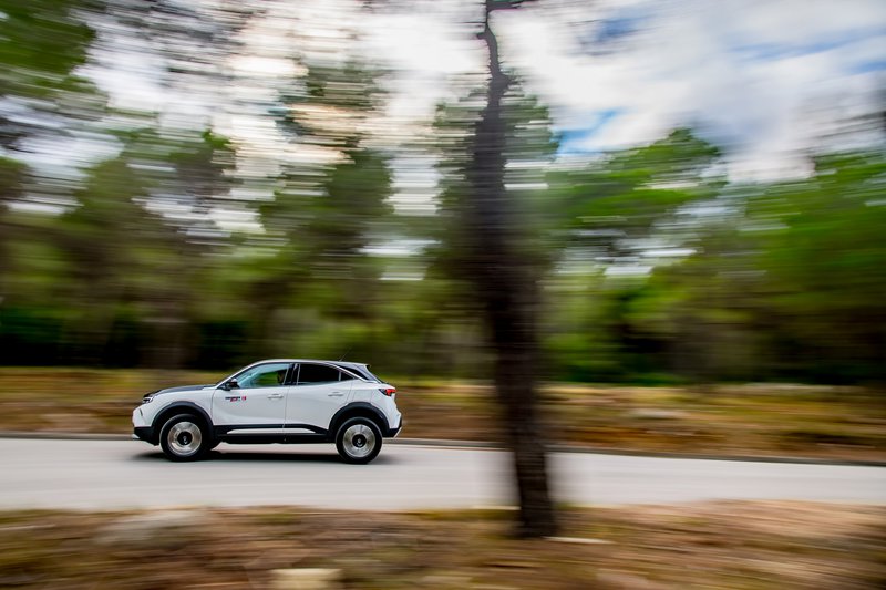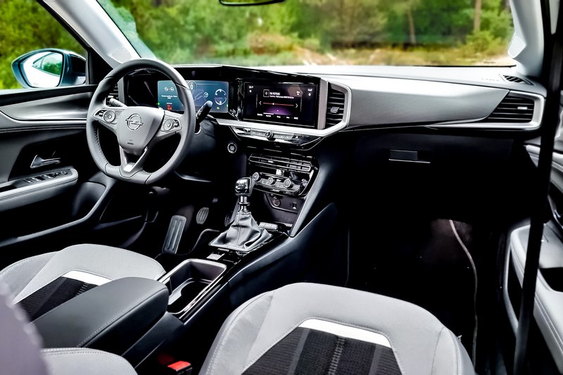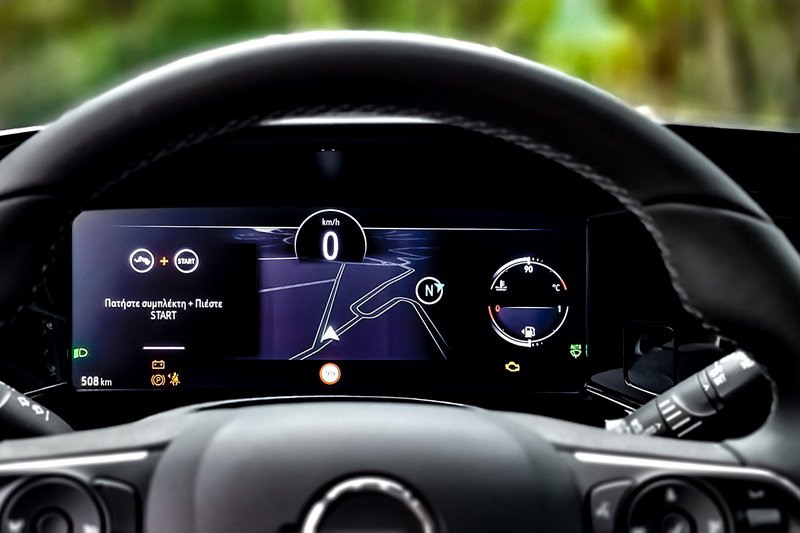Το εσωτερικό προσφέρει μια τυπική, για σπορ υλοποίηση, ευρυχωρία (καλοί χώροι εμπρός, μέτριοι πίσω, χώρος αποσκευών στα 350 λίτρα) έχει όμως και δύο χαρακτηριστικά που απαιτούν λίγο χρόνο εξοικείωσης: ψηλό μαρσπιέ για την είσοδο στην καμπίνα και αντίστοιχα μεγάλο ύψος φόρτωσης του πορτμπαγκάζ. Χτίζεται δε με τη νέα συνταγή της Opel, ήγουν ένα ψηλά τοποθετημένο ταμπλό καμωμένο με μαλακά, ποιοτικά πλαστικά, με δύο ψηφιακές οθόνες και ελληνικό μενού, που είναι, για ευνόητους λόγους όμοια δομημένο ως προς τις πληροφορίες που παρέχει με τα γαλλικά αδέλφια του. Παραμετροποιήσιμη η οθόνη που αναλαμβάνει χρέη πίνακα οργάνων, όχι όμως και η απόδοση του κινητήρα στο αυτοκίνητο δοκιμής μας, παρότι διατίθεται κάτι τέτοιο και βοηθά να αποκτήσει το σύνολο περισσότερη ζωντάνια. Υπάρχουν φυσικοί διακόπτες που αναλαμβάνουν χρέη για τη λειτουργία βασικών λειτουργιών και του κλιματισμού η οποία όμως γίνεται και μέσω της οθόνης στο κέντρο του ταμπλό (κάτι σε πλεονασμό κάνει αυτό). Χώροι για μικροαντικείμενα υπάρχουν, όχι βέβαια στα… ιαπωνοκορεάτικα πρότυπα αλλά όπως και να έχει θα βολευτούν κάποια καθημερινά χρειώδη (smartphone, ψιλά κ.λπ.).