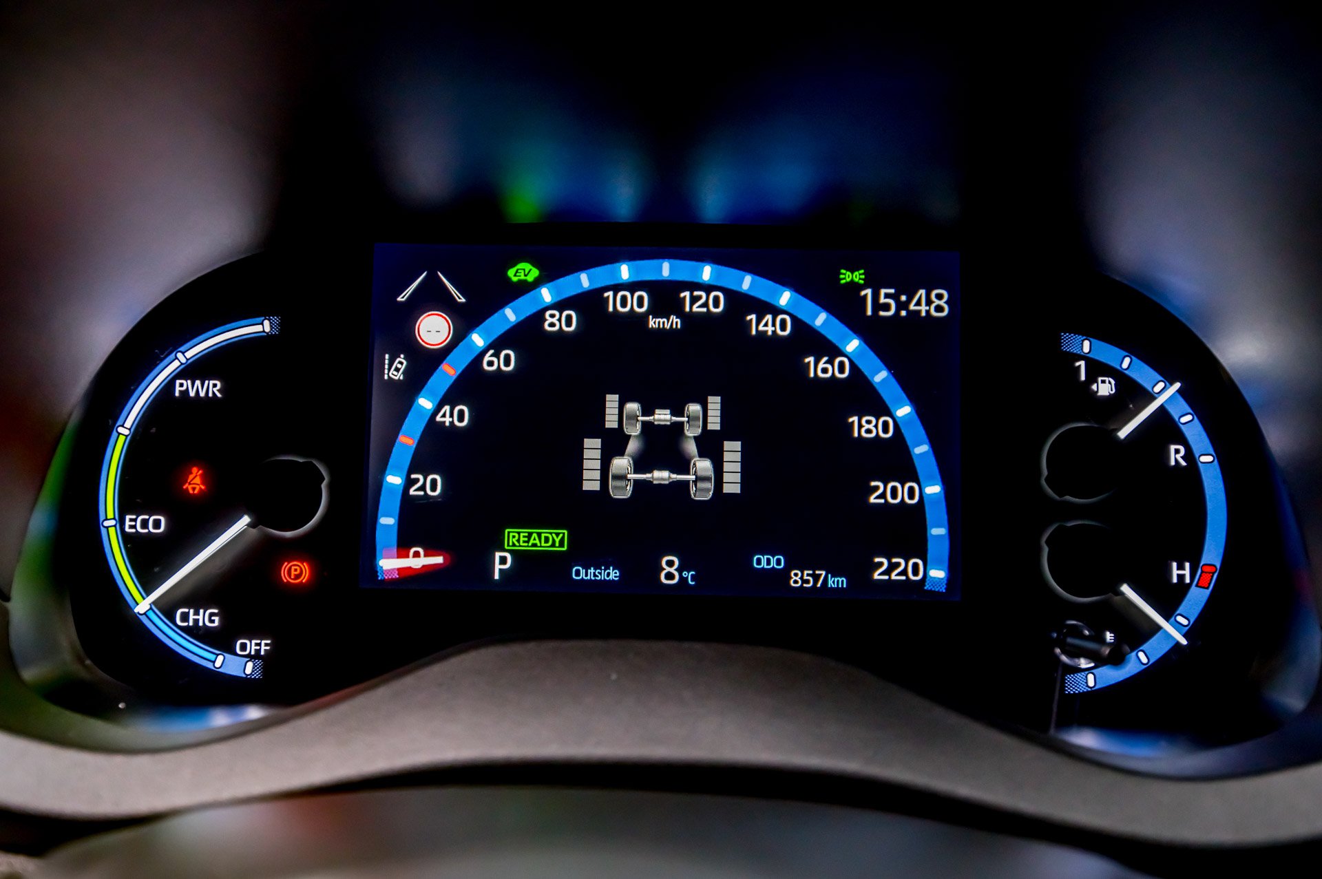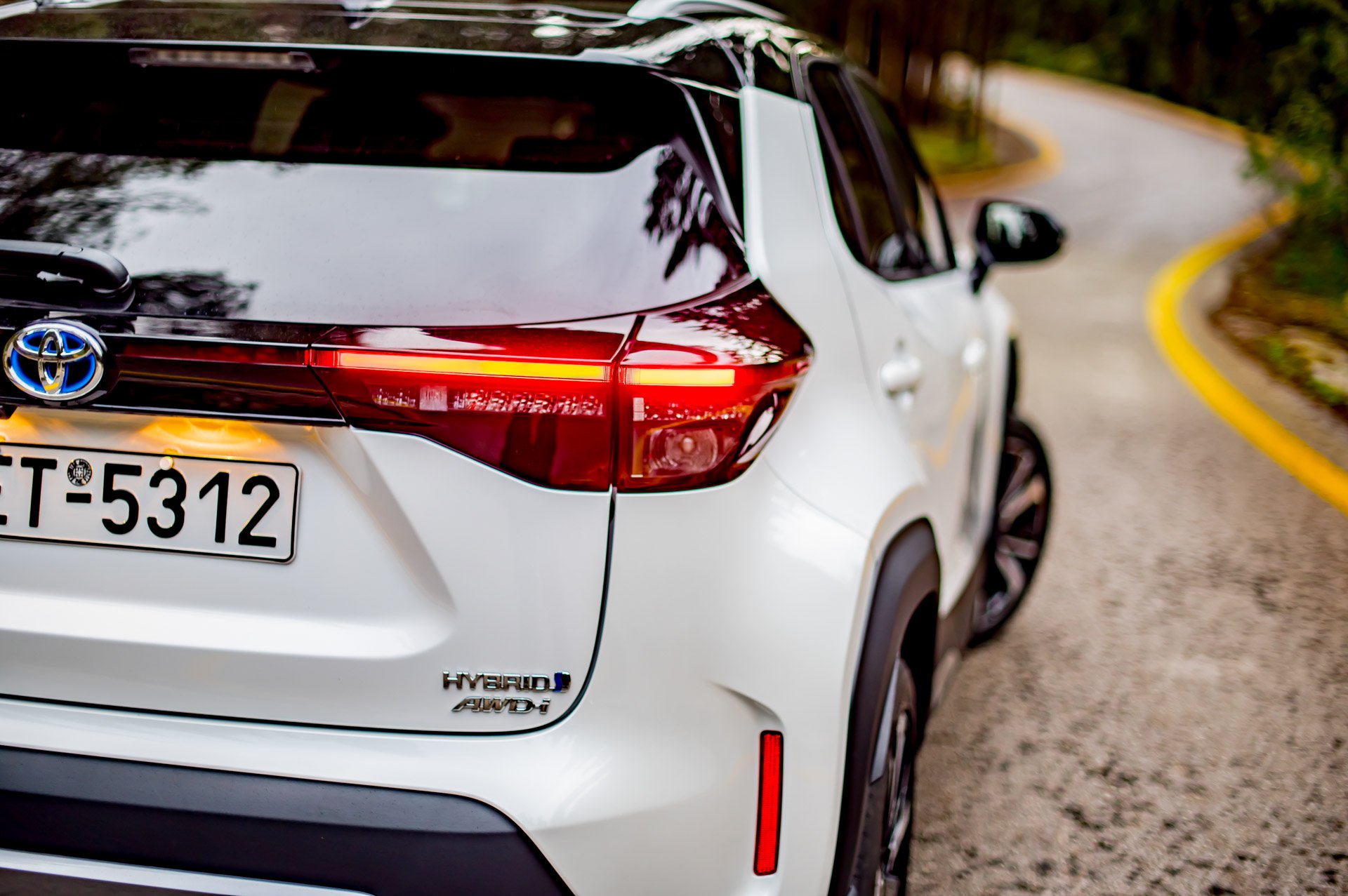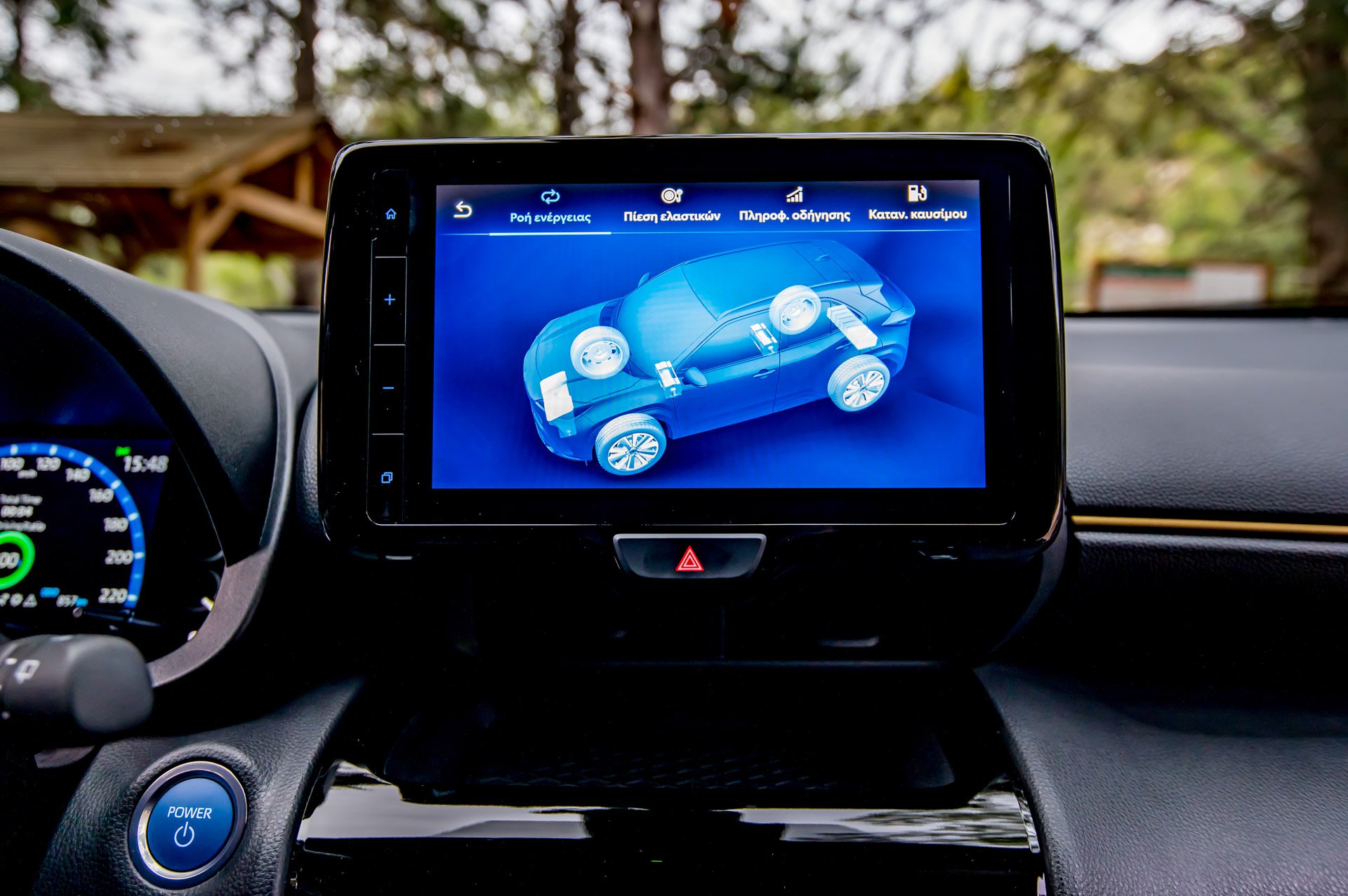 Σε εκκίνηση με σταθερή ταχύτητα, αυτό το Yaris Cross είναι αποκλειστικά προσθιοκίνητο. Η μετάδοση κίνησης στον εμπρός και στον πίσω άξονα ρυθμίζεται αυτόματα μεταξύ 100:0 και 40:60, ανάλογα με τις συνθήκες οδήγησης και την πίεση του πεντάλ γκαζιού. Η σχεδίαση είναι συμπαγής και ελαφριά σε σύγκριση με τα μηχανικά συστήματα AWD, επομένως υπάρχει μικρή μόνο επίδραση στην κατανάλωση καυσίμου και εκπομπών ρύπων, ενώ συνάμα είναι άμεση και… ακούραστη ως ηλεκτρική. Από την άλλη, υπάρχουν οι επιλογές «Normal» για κανονική οδήγηση, «Trail» και «Snow». Η λειτουργία «Trail» είναι η επιλογή όταν ένας ή περισσότεροι από τους τροχούς δεν μπορούν να βρουν πρόσφυση, για παράδειγμα σε ανώμαλο ανάγλυφο. Το σύστημα AWD-i θα φρενάρει αυτόματα όλους τους τροχούς, κατευθύνοντας την κινητήρια δύναμη σε αυτούς με πρόσφυση. Η δε λειτουργία «Snow» μετριάζει την απόκριση του γκαζιού για να βοηθήσει τον έλεγχο κατά την οδήγηση σε χιόνι ή πάγο. Το περιβάλλον οδήγησης είναι τυπικό ενός υβριδικού Toyota, διακρίνοντας στον πίνακα οργάνων το όργανο απεικόνισης της απόδοσης του υβριδικού συστήματος αντί στροφόμετρου. Όλη η δουλειά, όμως, γίνεται από τη βάση του επιλογέα κίνησης (δεν λέμε ταχυτήτων, λόγω της e-CVTφιλοσοφίας). Εδώ βλέπουμε μια πλειάδα διακοπτών που ορίζουν τόσο το EV mode (αμιγή ηλεκτροκίνηση εφόσον οι μπαταρίες είναι φορτισμένες επαρκώς), drive mode για επιλογή ανάμεσα σε Eco και Power κίνηση, με προφανή χαρακτηριστικά, και Drive mode, με τα προαναφερθέντα προγράμματα τετρακίνησης.
