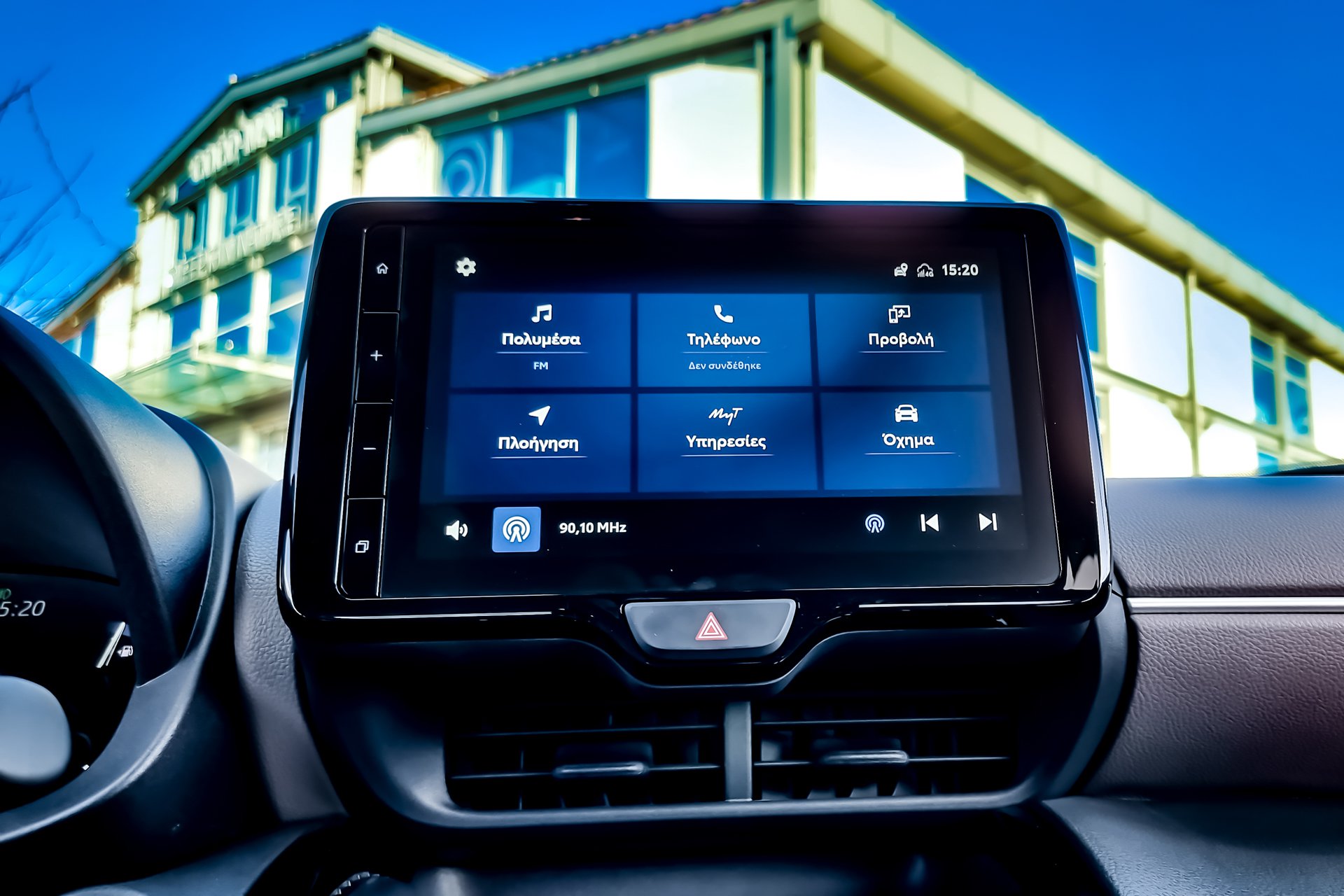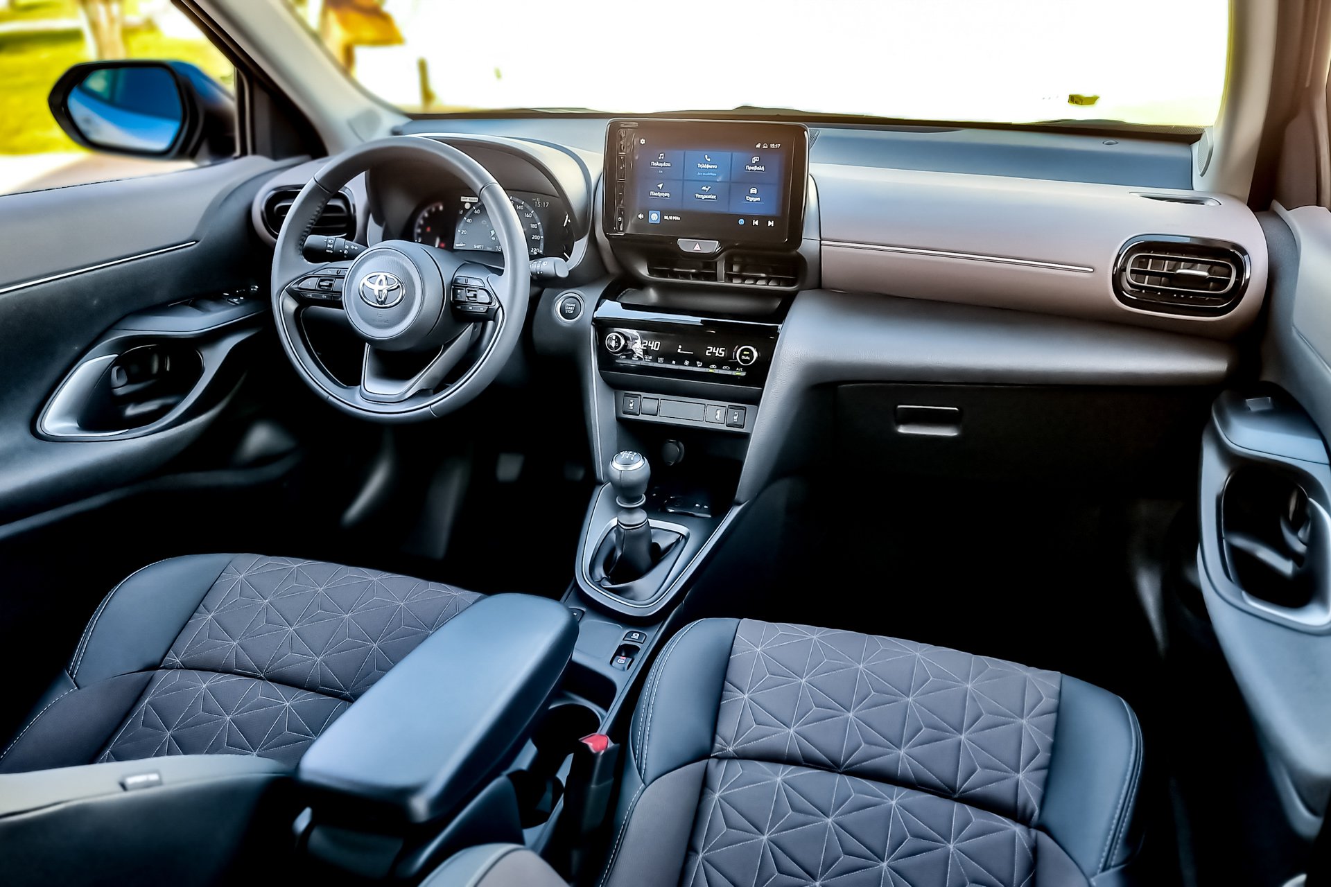 Η είσοδος στην ημίψηλη καμπίνα, είτε στο ένα είτε στο άλλο, δεν επιφυλάσσει εκπλήξεις, με το ελαφρύ δρασκέλισμα και την αφ’ υψηλού θέση οδήγησης. Αρκετά στοιχεία είναι νέα σε σχέση με το Yaris hatchback, όπως οι εμπρός κολόνες, τα μαρσπιέ και η κεντρική κονσόλα, τα τελειώματα για τα πάνελ των θυρών και τα υποβραχιόνια. Η κεντρική κονσόλα φιλοξενεί στην κορυφή της την εξελληνισμένη οθόνη πολυμέσων 9 ιντσών με την ομπρέλα Toyota Smart Connect και τέσσερις φυσικούς διακόπτες να εκτελούν χρέη άμεση πρόσβασης (μας έλειψαν οι πολλοί διακόπτες του απλού Yaris). Μια σειρά ακόμα από διακόπτες ομαδοποιούνται ακριβώς πέριξ του μοχλού αλλαγής ταχυτήτων 6 σχέσεων, ή του επιλογέα της υβριδικής έκδοσης (θα δούμε μαζί τι κάνουν).