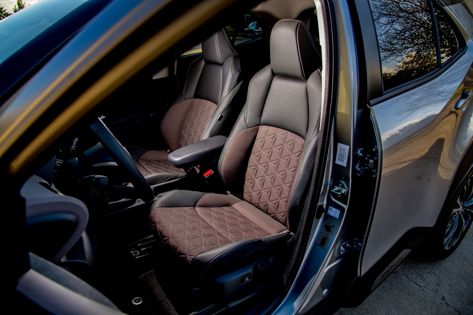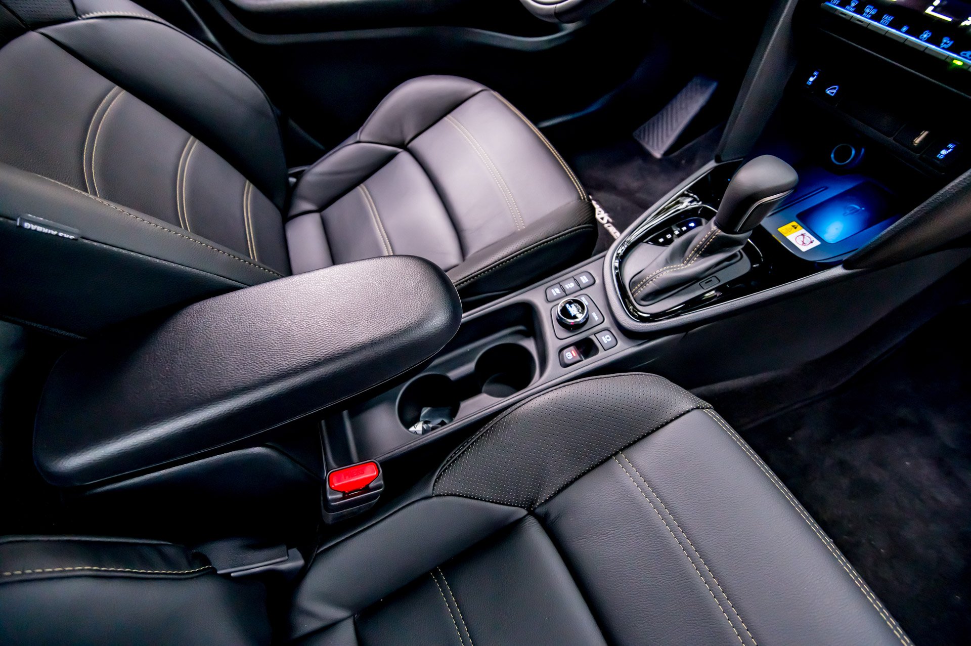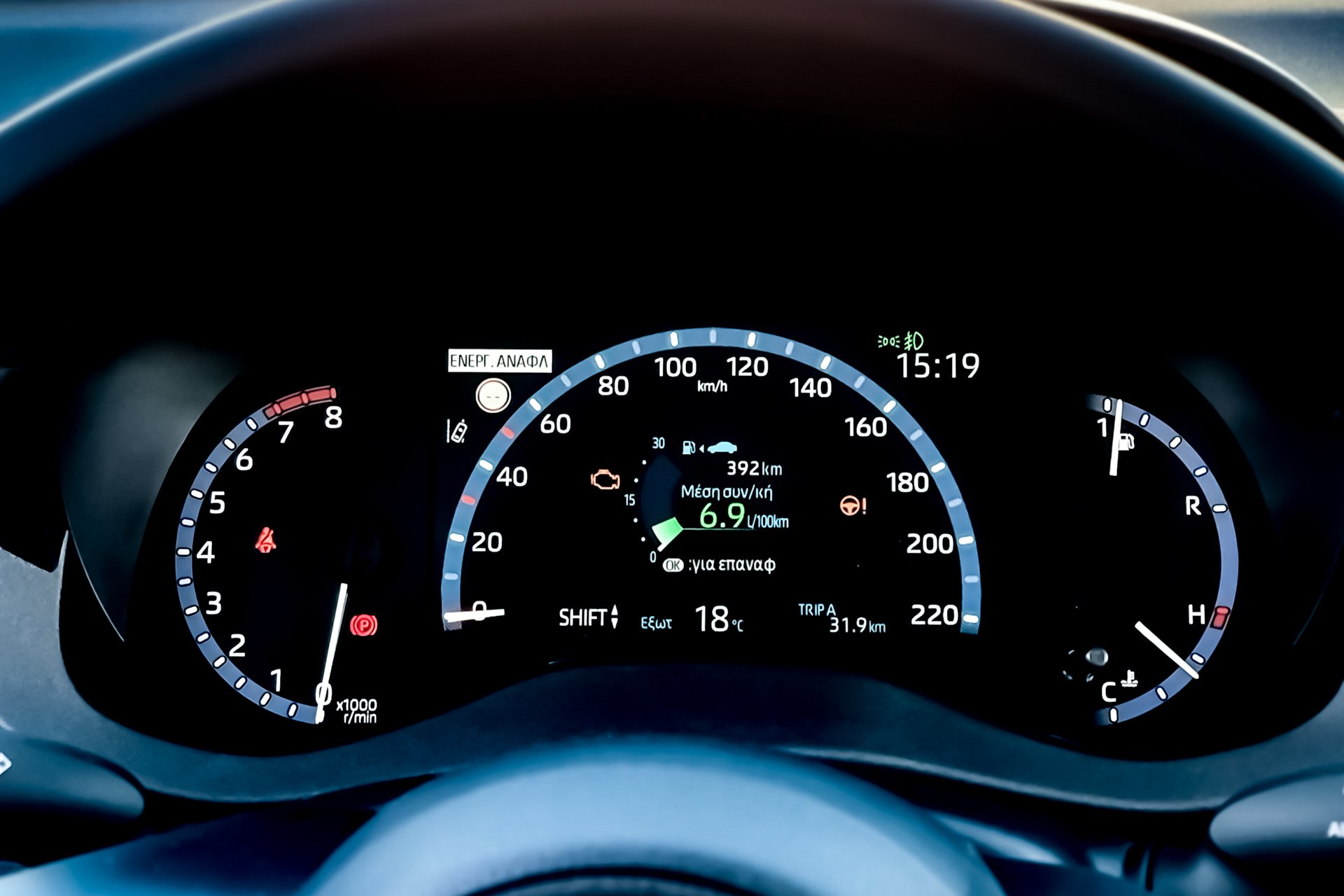 Σε αμφότερα δε τα Yaris Cross δοκιμής μας το ταμπλό αποτελείται από σκληρά και μαλακά πλαστικά ενώ ο πίνακας οργάνων είναι ψηφιακός με στοιχεία αναλογικά, όπως το στροφόμετρο και οι δείκτες με –επίσης- ελληνικό μενού με τις άφθονες πληροφορίες, που το διαχειρίζεσαι από το ολοστρόγγυλο (και όχι flat-bottom) πολυλειτουργικό τιμόνι. Από τους διακόπτες του οποίου θα θέλαμε, όμως, μια περισσότερο στιβαρή αίσθηση στην πίεση. Και οι δύο εκδόσεις Elegant και Adventure της δοκιμής μας διαθέτουν, επίσης, επενδύσεις σε μαύρη λάκα, θερμαινόμενα μπροστινά καθίσματα, διζωνικό κλιματισμό, ηλεκτροχρωμικό καθρέφτη και γαλάζιο φωτισμό περιβάλλοντος γύρω από τα πόδια, τα πάνελ των θυρών και την κεντρική κονσόλα για το ανάλογο eco εφέ.