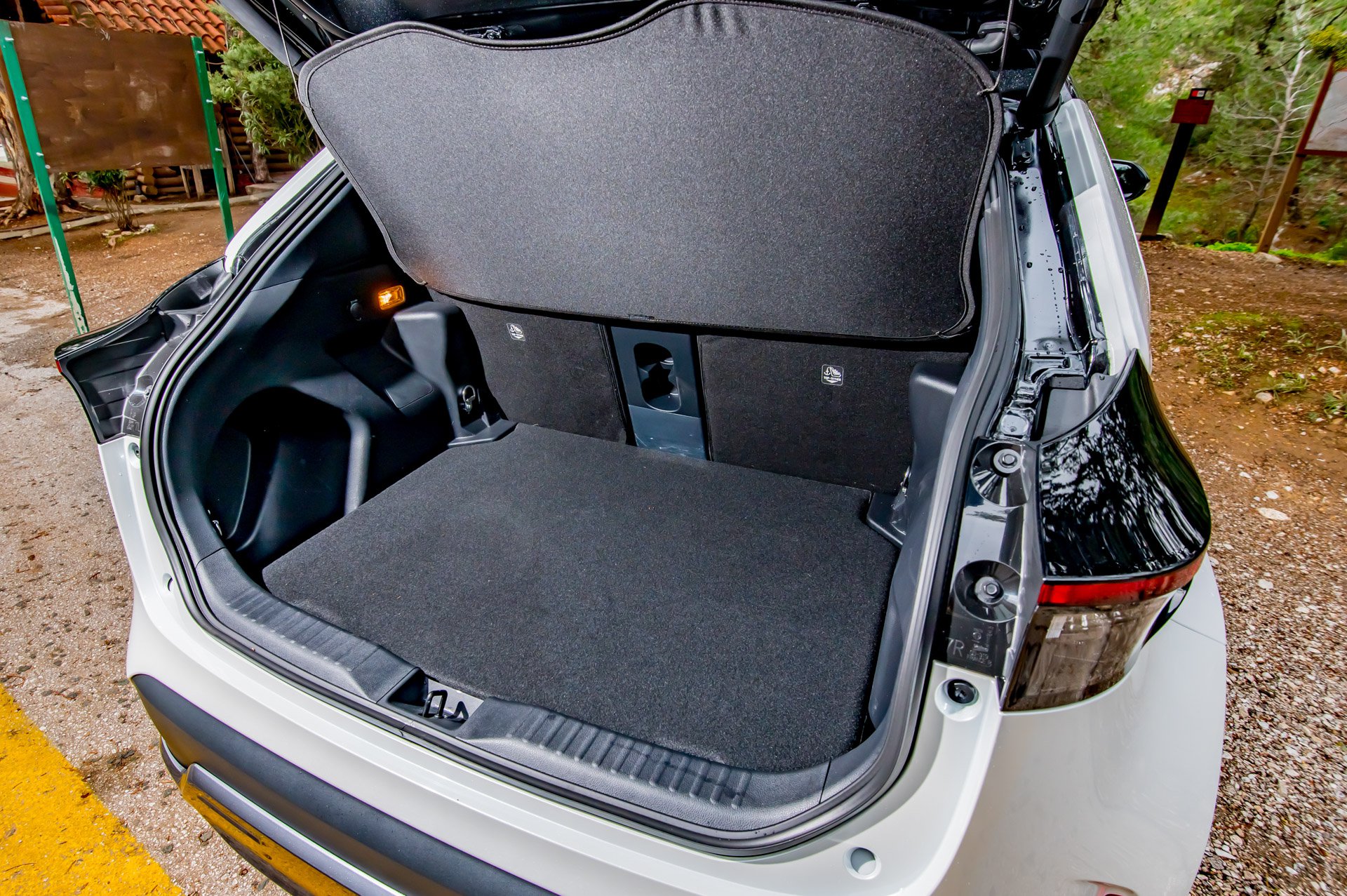 Η ευρυχωρία για μικροαντικείμενα είναι δεδομένη, (δείτε το ραφάκι ψηλά, αλλά και το βαθύ ράφι στη βάση της κονσόλας ή τις χούφτες των θυρών και θα καταλάβετε). Απλώς το μικρό μεταξόνιο ορίζει κάποιες υποχωρήσεις για τους πίσω επιβάτες, οι οποίοι εισέρχονται μέσα από μάλλον μικρές πόρτες που ευτυχώς ανοίγουν διάπλατα. Όχι, όμως, και για τις αποσκευές, αφού υπάρχουν 397 λίτρα διαθέσιμου χώρου αποσκευών στο συμβατικό Yaris Cross που περιορίζεται λόγω τετρακίνησης (και όχι λόγω μπαταριών οι οποίες βρίσκονται κάτω από το πίσω κάθισμα) στα 320 λίτρα για το υβριδικό μοντέλο. Θα ήταν περιττό να αναφέρουμε ότι το Yaris Cross και στις δύο περιπτώσεις θωρακίζεται με έλεγχο ευστάθειας οχήματος με υποβοήθηση διεύθυνσης (S-VSC), που παρέχει έλεγχο των λειτουργιών ABS, VSC και TRC του αυτοκινήτου και ηλεκτρικό σύστημα διεύθυνσης. Άλλα συστήματα περιλαμβάνουν το Active Cornering Assist (ACA), το Secondary Collision Brake (SCB) και το Brake Hold (BH). Επίσης, το ισχυρότερο Toyota Safety Sense προσφέρει στάνταρ κεντρικούς αερόσακους, Monitor Blind Spot και Rear Cross-Traffic Alert με αυτόματο φρενάρισμα. Τέλος, η Toyota όλα τούτα τα ονόμασε T-Mate(φιλαράκι) για να έχουμε την αίσθηση ότι «κάποιος» και όχι «κάτι» μας προστατεύει.