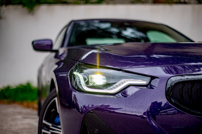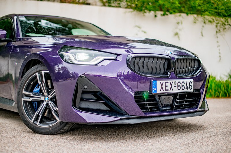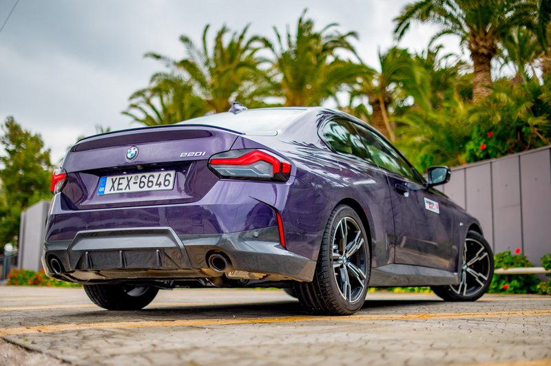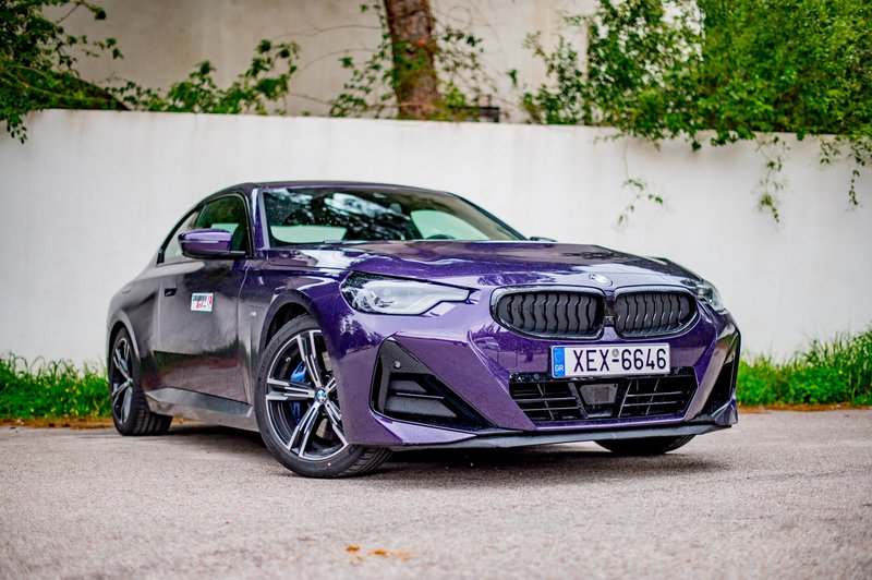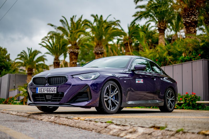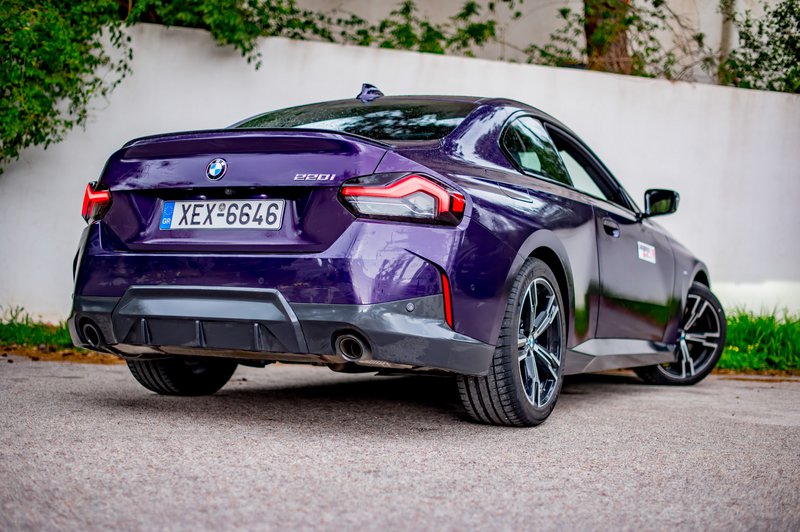 Το αυτοκίνητο της δοκιμής μας ήταν η έκδοση Μ Sport (τιμή από 49.288€) που κάνει ακόμα πιο «δραματική» την εμφάνιση του μοντέλου με το αεροδυναμικό πακέτο που περιλαμβάνει τονισμένους προφυλακτήρες, πλαϊνά skirts και πίσω spoiler και τις όμορφες ζάντες των 18 in με τα ασύμμετρα ελαστικά πλάτους 225-255 εμπρός πίσω. Την ιδιαίτερη εικόνα συμπληρώνει η μωβ απόχρωση του αμαξώματος που η BMW ονομάζει Thundernight και η οποία προσφέρεται αποκλειστικά στην 2 Coupé. Πάντως, μια παρόμοια απόχρωση θυμόμαστε ότι υπήρχε και στην Ε36!