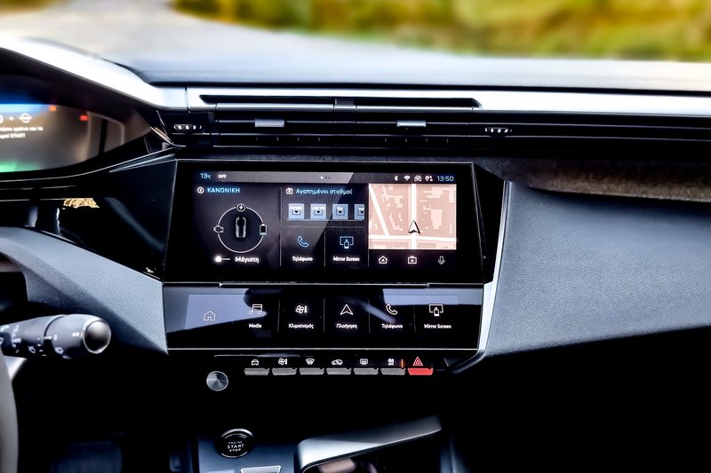 Αυτό που, επίσης, προσφέρει το 308 είναι η αίσθηση ενός όμορφου, άνετου και ευρύχωρου περιβάλλοντος (κι αυτό παρά την ύπαρξη της υψηλά τοποθετημένης κονσόλας που διαχωρίζει τον εμπρός χώρο σε δύο ενότητες). H αίσθηση ποιότητας είναι, επίσης, έκδηλη, τόσο με το μάλλον αντιεργονομικό i-Cockpit, όσο και με τις οθόνες αφής μέσω των οποίων χειρίζεσαι τα ελληνικά μενού, τα οποία έχουν πυκνή πληροφόρηση και απαιτούν χρόνο εξοικείωσης.