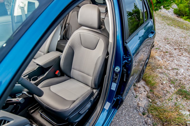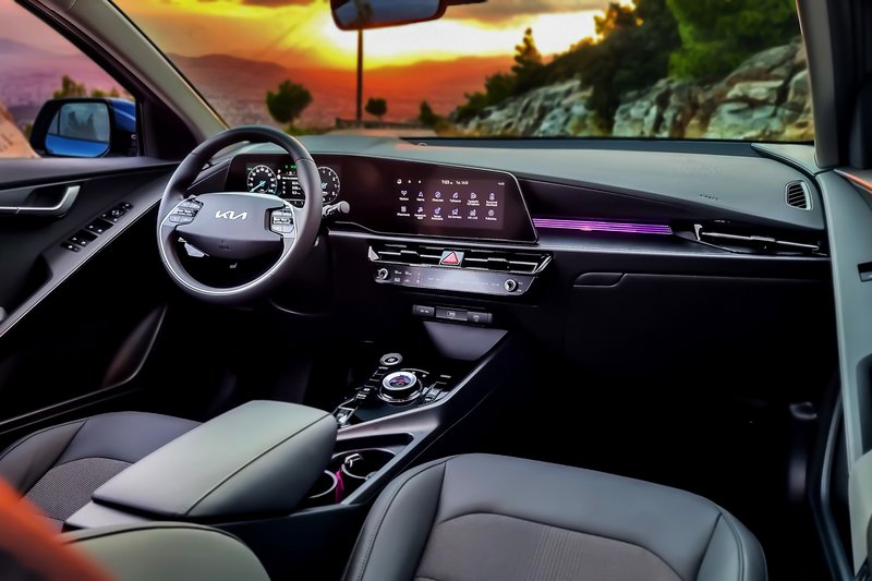 Το εσωτερικό του δεν έχει καμία σχέση με το Niro που γνωρίσαμε. Το ταμπλώ που έχει μια αφαιρετική προδιάθεση όντας λεπτό, φιλοξενεί δύο οθόνες 10,25 ‘’ που παρέχουν λειτουργίες για τον οδηγό και το infotainment, ενώ μια οθόνη αφής πολλαπλών λειτουργιών σε άπταιστα ελληνικά επιτρέπει τον έλεγχο του infotainment και του συστήματος κλιματισμού, ελαχιστοποιώντας την απόσπαση της προσοχής του οδηγού. Εδώ, βέβαια, θα βρούμε και μια ακόμα… γκατζετιά, την πολλαπλών ενδείξεων λωρίδα κάτω από την κεντρική οθόνη που μεταβάλλει το είδος των εξεικονιζόμενων πληροφοριών (το είχαμε πρωτοδεί στο Nissan Juke πρώτης γενιάς), ανάμεσα σε αυτές του κλιματισμού και των πολυμέσων. Θέλει λίγη δουλίτσα στην εκμάθηση αυτό.