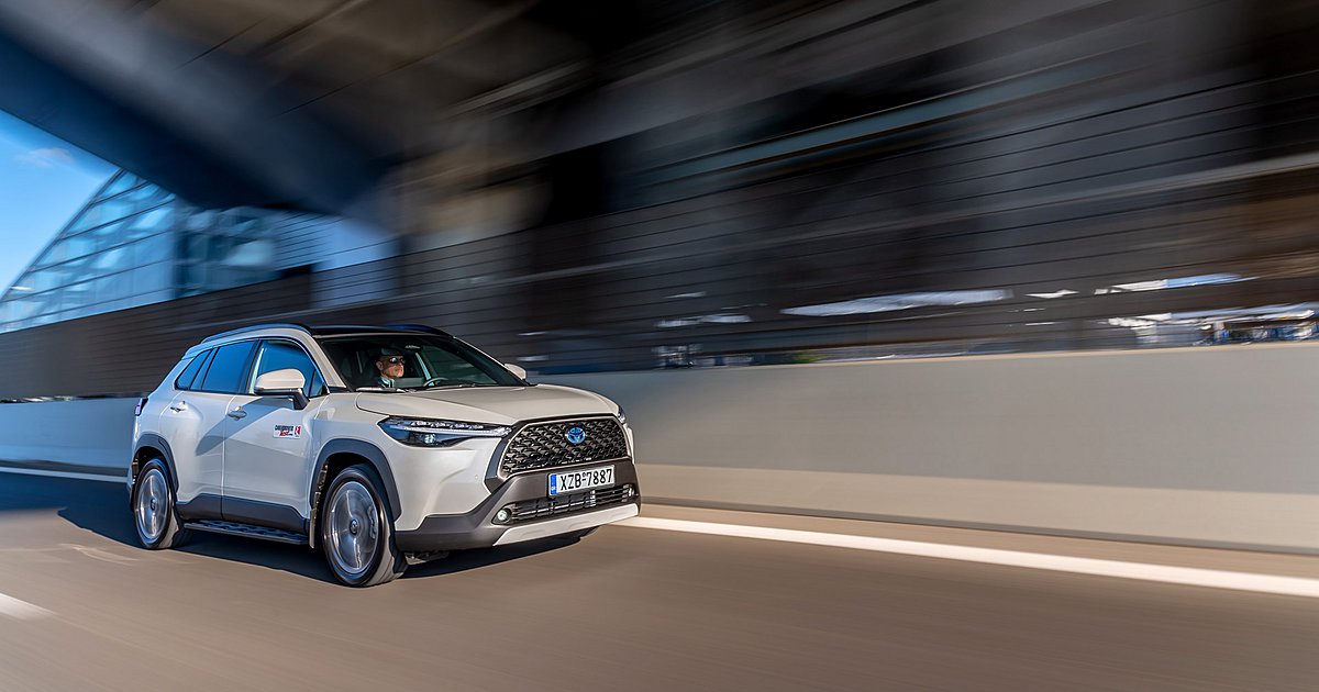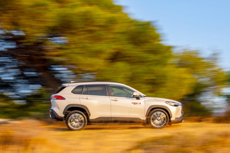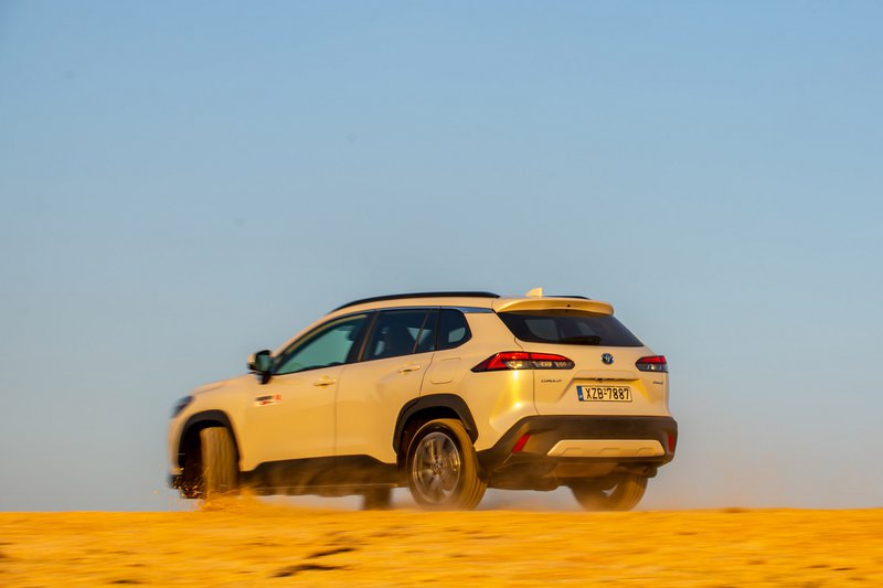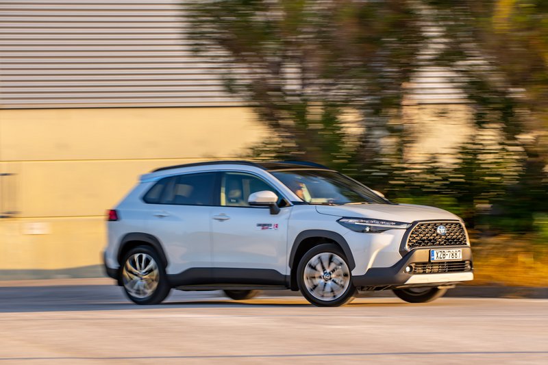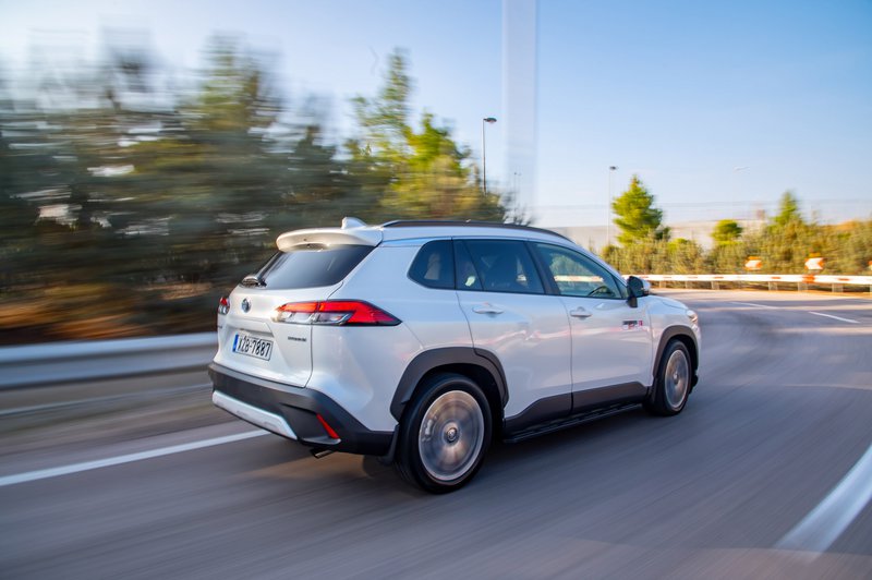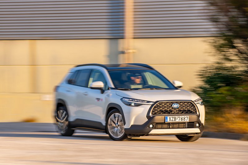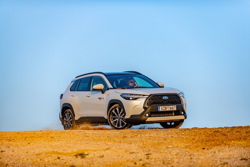 Η νέα Toyota Corolla Cross είναι πολύ πολύ ενδιαφέρουσα στο οδηγικό πεδίο. Θα ξεκινήσουμε με τις διαπιστώσεις μας από οδήγηση υπό πίεση μιας και αυτές μας έκαναν ιδιαίτερα θετική εντύπωση. Στρίβει, φρενάρει, κινείται σε καλό ή κακό οδόστρωμα με χαρακτηριστική άνεση, σιγουριά με Dunlop SP Sport Maxx 050, 225/50-R18 και έναν ευπρόσδεκτο έλεγχο, χαρακτηριστικά που, συνήθως, συναντάς σε αυτοκίνητα πιο χαμηλά, άλλων κατηγοριών. Υπάρχει ένα μυστικό εδώ. Το αυτοκίνητο δηλώνεται «Cross» και τέτοιο είναι με τα 16 cm απόστασης από το έδαφος που δεν τα λες πολλά. Συνάμα, το κέντρο βάρους είναι σχετικά χαμηλά τοποθετημένο από τις μπαταρίες που βρίσκονται κάτω από τα πίσω καθίσματα και έχετε ένα αυτοκίνητο με χάρες ενός κανονικού αυτοκινήτου. Ναι, θα πάρει κλίσεις στις στροφές, αλλά όχι τρομακτικά πράγματα και κυρίως όχι στρεβλώσεις.