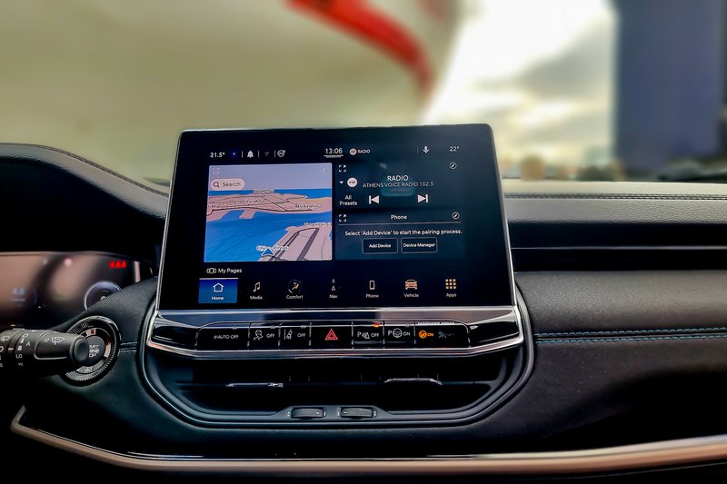 Σε κάθε περίπτωση, υπάρχει η αίσθηση της επαρκούς ισχύος και μάλιστα με την αμεσότητα ενός διπλοσύμπλεκτου κιβώτιου στα ανεβάσματα σχέσεων και ρυθμού (θα το κακίσουμε λίγο, γιατί στα αυτόματα κατεβάσματα έχει τα σκαλάκια του). Η ηλεκτροκίνηση μπορεί να έρθει με σχετική οπτική ενημέρωση από τον ψηφιακό πίνακα οργάνων και την κεντρικά τοποθετημένη ψηλά οθόνη πολυμέσων. Αμφότερες έχουν έναν πακτωλό πληροφοριών (η Jeep κορυφαία σε αυτό).