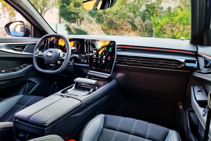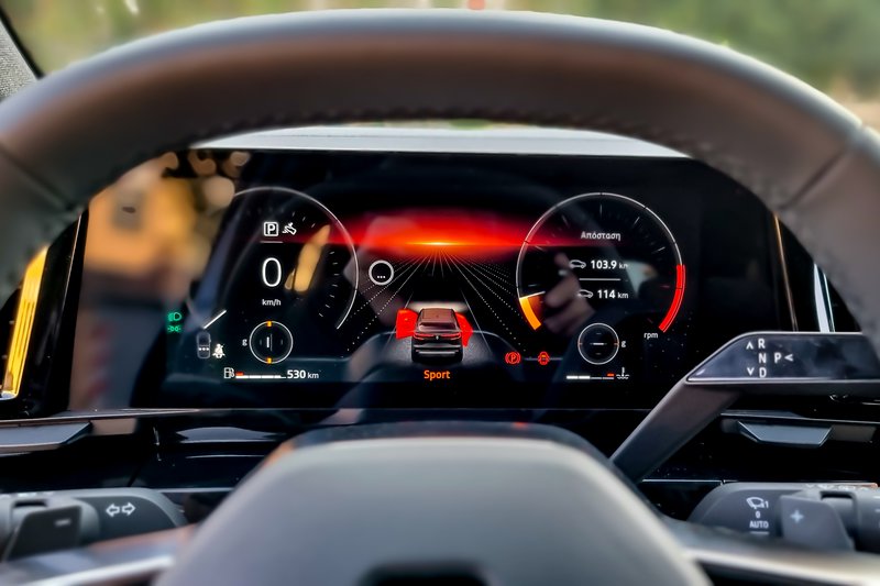 Οι δύο μεγάλες οθόνες υψηλής ανάλυσης, μία για τον πίνακα οργάνων και μία για τα multimedia και οι δύο 12”, δημιουργούν έναν εκτεταμένο πίνακα πληροφοριών σε σχήμα γάμα κεφαλαίο (Γ, με τη μεγάλη του πλευρά οριζόντια), στον οποίο μπορείς να δεις μια σειρά ενδιαφέρουσες και ευανάγνωστες απεικονίσεις. Αντιλαμβάνεστε, βεβαίως, ότι αυτό το «σκηνικό» παραπέμπει σε μία μεγάλη λίστα προηγμένων συστημάτων υποβοήθησης του οδηγού (ADAS) για τα οποία προσφέρονται οι αντίστοιχες δυνατότητες ρύθμισης από τον οδηγό.