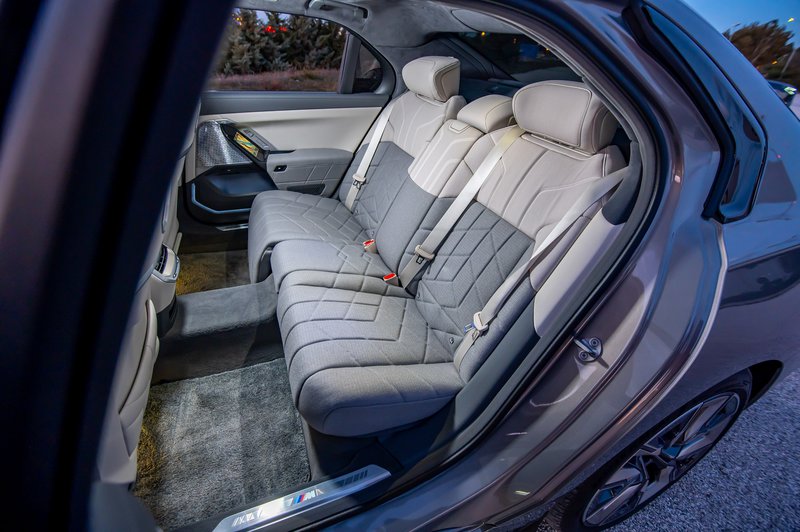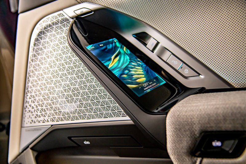 Κοιτώντας τη BMW i7 από το πλάι, δεν αργείς να συνειδητοποιήσεις όχι μόνο το πόσο μακρύ είναι το αυτοκίνητο, αλλά και το πόσο μεγαλύτερη είναι η πίσω πόρτα! Προφανώς, το πελώριο μεταξόνιο των 3,215 m αξιοποιήθηκε δεόντως – για να δημιουργηθεί ένας τεράστιος χώρος στο πίσω κάθισμα, ένα σαλόνι για δύο. Μην ξεχνάτε ότι αυτοκίνητα όπως η i7 κατασκευάζονται για να μεταφέρουν με τη μέγιστη δυνατή άνεση τον ευτυχή κάτοχό τους (ή τον/τη σύζυγό του) προσφέροντάς του πολυεπίπεδη πολυτέλεια. Το «κάθομαι σταυροπόδι» στο πίσω κάθισμα δεν φτάνει για να περιγράψει την άνεση που προσφέρουν οι δύο ηλεκτρικά ρυθμιζόμενες πολυθρόνες, ενώ η έννοια της χλιδής στο αυτοκίνητο απογειώνεται με τον… κινηματογράφο, την 32άρα 8Κ οθόνη που αποτελεί προαιρετικό εξοπλισμό (δεν διέθετε η «δική μας» i7, αλλά μπορείς να την παραγγείλεις).