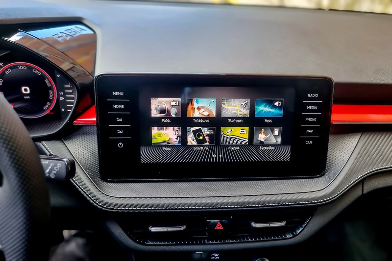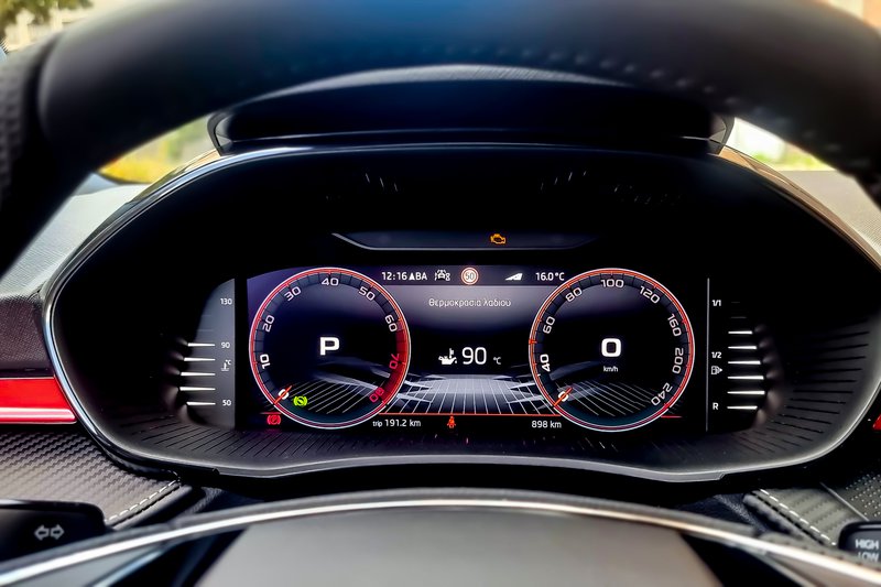 Στο εσωτερικό, η “badass” εικόνα συνεχίζεται με το μαύρο να αντιπαλεύει τις άφθονες κόκκινες πινελιές στο ταμπλώ. Τα υπέροχα, χορταστικά σπορ καθίσματα από τα καλύτερα στην αγορά αγκαλιάζουν το σώμα ιδανικά για τον οδηγό που έχει μπροστά του ένα flat-bottom πολυλειτουργικό τιμόνι με περφορέ δέρμα, ενθέσεις σε απομίμηση ανθρακονήματος και πλήρως ψηφιακό περιβάλλον με δύο ψηφιακές οθόνες πλούσια παραμετροποιήσιμες και ευανάγνωστες στα ελληνικά με πλήρη διασυνδεσιμότητα με τα κινητά μας και με αυτήν που εκτελεί χρέη πίνακα οργάνων να είναι 10,25 ιντσών. Στην κεντρική οθόνη διακρίνουμε τα drive modes (Sport, Eco, Normal, Individual) που κουρντίζουν ανάλογα το μηχανικό σύνολο. Κάτω από την οθόνη, βρίσκεται ο μεγάλος κλασικός επιλογές που όμως κρύβει το 7άρι διπλοσύμπλεκτο DSG κιβώτιο. Δυστυχώς δεν είχαμε paddles στο τιμόνι ενώ και οι χειροκίνητες αλλαγές μέσω του επιλογέα γίνονται προς την πλευρά του συνοδηγού, κάτι ελάχιστα βολικό. Βολική όμως είναι η πρακτικότητα με τη Skoda, για μια ακόμη φορά, να έχει έξυπνες λύσεις για διαχείριση μικρών ή μεγάλων αντικειμένων, με τον χώρο αποσκευών να αγγίζει τα 380 λίτρα! Σε επίπεδο ασφάλειας, το αυτοκίνητο διαθέτει έως εννέα αερόσακους και κορυφαία ενεργητική και παθητική ασφάλεια, με βαθμολογία πέντε αστέρων στις δοκιμές του Euro NCAP. Για πρώτη, δε, φορά διαθέτει τα συστήματα υποβοήθησης οδηγού Travel Assist, Park Assist και Maneuver Assist. Όμως, μάλλον θέλετε να μάθετε για τα άλλα…