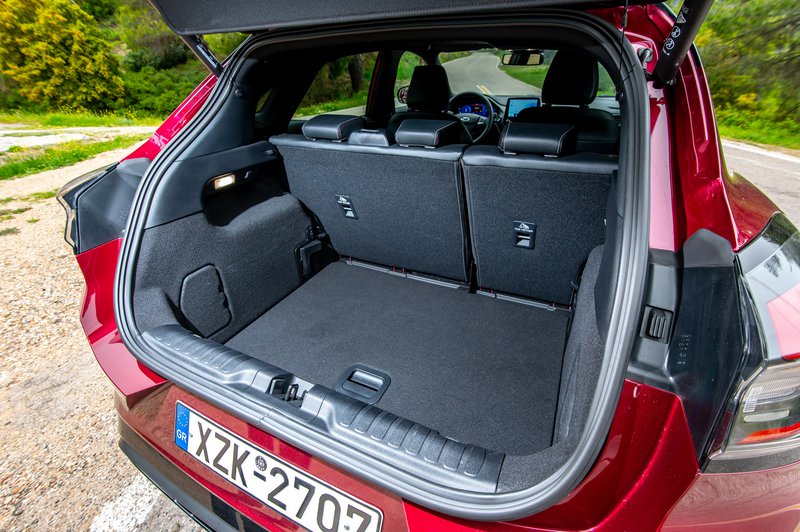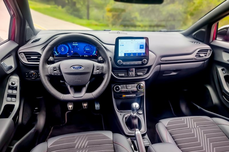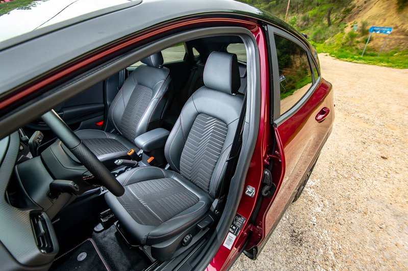 Θέλετε κι άλλα; Full αυτοματισμοί, αλλά και σπορ –θερμαινόμενα– καθίσματα, με τα ανάλογα υλικά και κόκκινες ραφές (θα τα θέλαμε λίγο πιο χορταστικά σε μέγεθος και στήριξη), flat bottom τιμόνι με περφορέ δέρμα, απομίμηση ανθρακονήματος στο ρηχό, αλλά ψηλά τοποθετημένο ταμπλώ και αρκετό αλουμίνιο εκεί που πρέπει (πεντάλ, επιλογέας). Οι χώροι τυπικοί ενός Fiesta (στο πάτωμά του, άλλωστε, βασίζεται), αλλά ο χώρος αποσκευών, με την απουσία της ρεζέρβας είναι πραγματικά τεράστιος, έχοντας και 80 L από το «πηγάδι» Megabox, στα έγκατα του πατώματος.