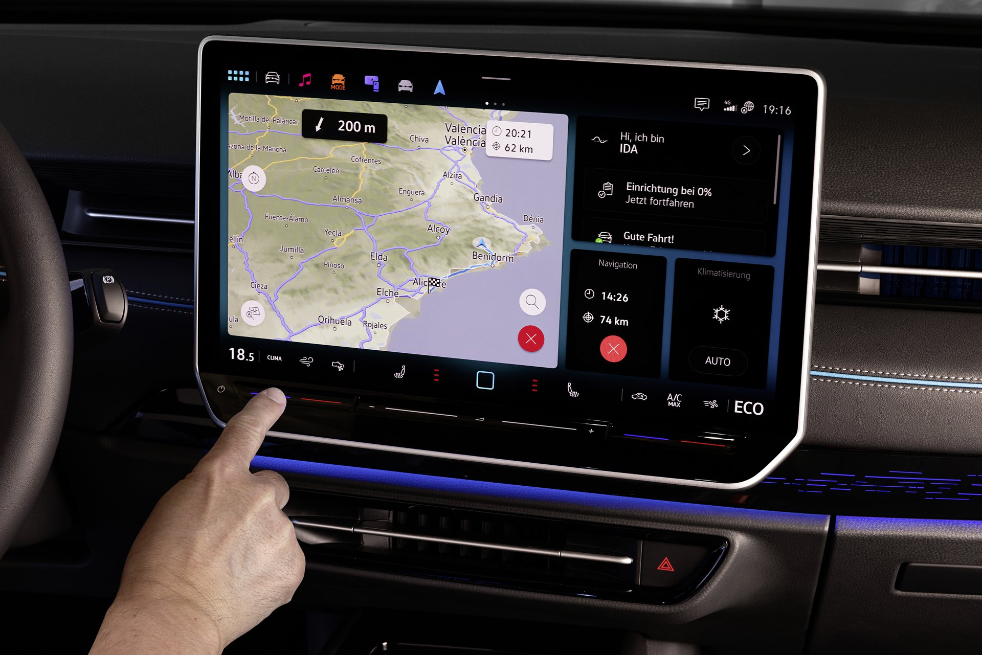 Βεβαίως, σημείο αναφοράς στο εσωτερικό, είναι η οθόνη του συστήματος infotainment με διαγώνιο 15 in στο κέντρο του ταμπλό, που προσφέρει αμεσότητα πρόσβασης σε όλους τους επιβάτες. Μάλιστα, ενδιαφέρον παρουσιάζει η απεικόνιση του συστήματος Navi με τα νέα γραφικά και την πιο ακριβή πληροφόρηση τεχνολογίας Discover Pro Max. Αντιθέτως, για τον πίνακα των οργάνων, η VW έχει διατηρήσει πίσω από το τιμόνι την μικρή οθόνη που γνωρίζουμε από τα υπόλοιπα ηλεκτρικά οχήματα του ομίλου, ενώ υπάρχει και η δυνατότητα απεικόνισης των ενδείξεων στο head-up display επαυξημένης πραγματικότητας, για επιπλέον ενημέρωση στον οδηγό.