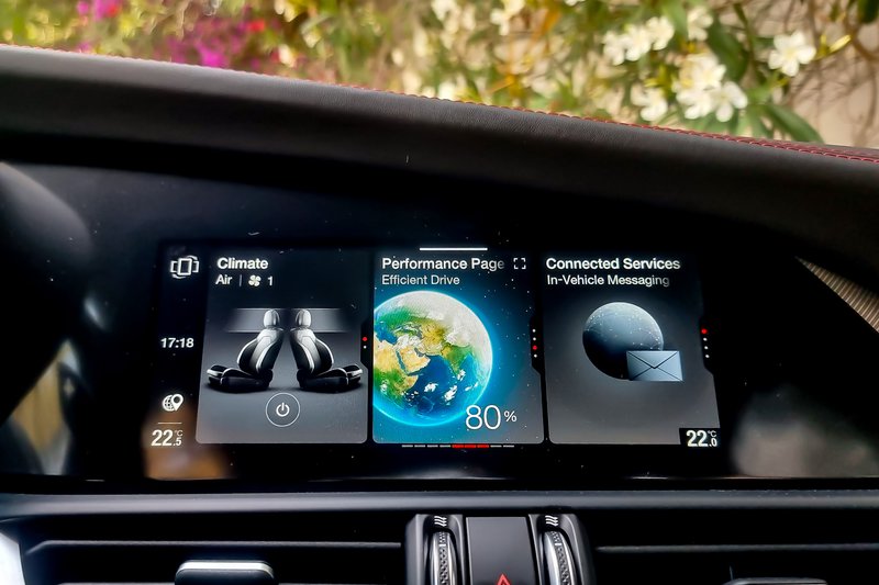 Εννοείται ότι το ADAS είναι πλήρες, με ενεργό σύστημα cruise control, σύστημα lane assist και σύστημα αυτόματου φρεναρίσματος, αλλά –ακόμα– εννοείται ότι η οθόνη αφής και ο σχετικός περιστροφικός διακόπτης είναι αργά σε αίσθηση και αλλαγή στα μενού. Στη βάση της κονσόλας συναντάμε και τον κλασικό διακόπτη DNA (Dynamic, Normal, Advanced Efficiency) για σχετικό κούρντισμα κινητήρα/κιβωτίου/τιμονιού με επιπλέον στο Dynamic το σφίξιμο της ανάρτησης (αν και μπορείτε να διατηρήσετε ένα επίπεδο άνεσης, επιλέγοντας τη λειτουργία Soft.