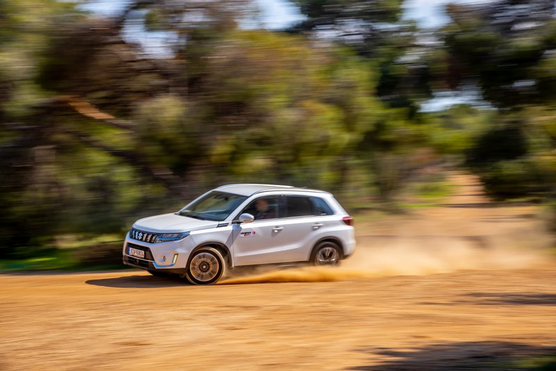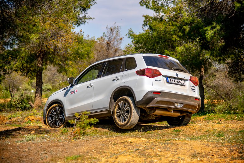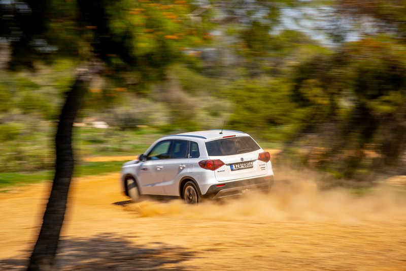 Σύμφωνα με τη Suzuki, με την μπαταρία πλήρως φορτισμένη, σε ηλεκτρική λειτουργία, το Vitara Strong Hybrid είναι δυνατό να αγγίξει τα 80 km/h ταχύτητας ή να καλύψει απόσταση έως και 4,5 km. Το αυτοκίνητο λειτουργεί αμιγώς ηλεκτρικά όταν εκκινεί από στάση, όταν κινείται με χαμηλή ταχύτητα, όταν κάνει όπισθεν και σε συνθήκες οδήγησης με σταθερή ταχύτητα. Οδηγώντας, αντιλαμβάνεσαι δυο τρία πράγματα. Το ένα είναι η ομαλή εναλλαγή ταχυτήτων του AGS. Ο… λόξιγκας στις αλλαγές του κιβωτίου στα απλά Suzuki με AGS κιβώτιο εδώ δεν υφίσταται, καθώς ο ηλεκτροκινητήρας επικουρεί στην απρόσκοπτη παροχή ισχύος από σχέση σε σχέση, με αποτέλεσμα η απόδοση να μην «κρεμάει» και οι ταχύτητες να μην «κλοτσούν». Βέβαια, για να είμαστε ειλικρινείς, ο βενζινοκινητήρας και μαζί ο ηλεκτροκινητήρας δίνουν βραδείες επιδόσεις αλλά, από την άλλη, υπό πίεση το Suzuki δεν θορυβεί ιδιαίτερα, ενώ υπάρχει και το πρόγραμμα Sport για ανήσυχα πνεύματα και… γεμάτα πορτοφόλια, καθώς η κατανάλωση είναι από αισθητά έως… πολύ αισθητά υψηλότερη συγκριτικά με άλλα υβριδικά αλλά και με ήπιο ρυθμό οδήγησης. Η συνολική αίσθηση είναι αυτή της άνεσης και μιας κάποιας ελαφρότητας από το σύστημα διεύθυνσης εντός ή εκτός ασφάλτου. Το να παίξεις με το Vitara στα χώματα είναι μια ασφαλής και προβλέψιμη διαδικασία, με την τετρακίνηση να πραγματοποιεί όσα υπόσχεται, αρκεί να ξέρετε να χειριστείτε μια κλασική, μηχανική τετρακίνηση, μιας και τα υλικά τριβής της μετάδοσης μπορεί να υπερθερμανθούν.