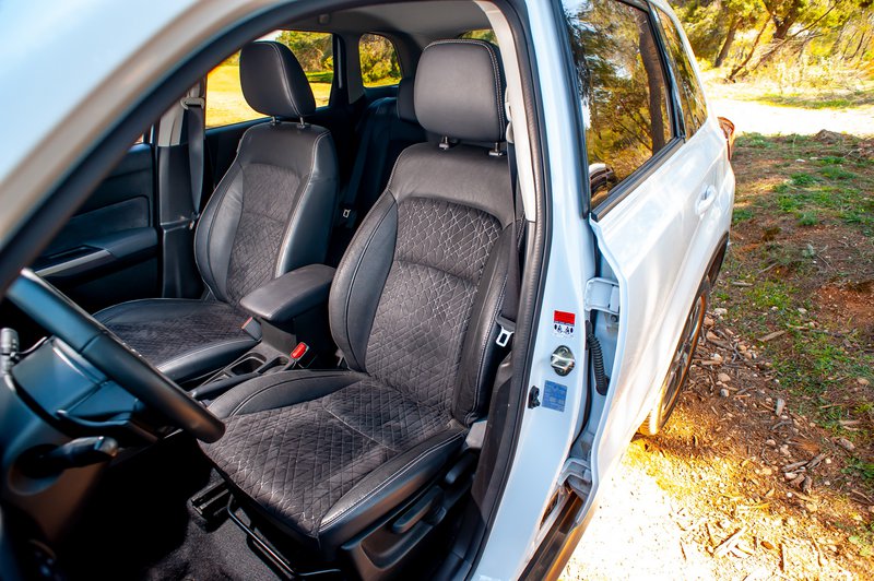 Στο εσωτερικό σε υποδέχεται ένα σύνολο με μαλακά και σκληρά πλαστικά, τυπική συναρμογή και ανάμεικτη εργονομία. Βλέπετε, έχει ακόμη πιεστικά μπουτόν εκατέρωθεν του αναλογικού/ψηφιακού πίνακα οργάνων για επιλογές των μενού (δύσχρηστο όταν οδηγείς) και συνάμα, το ηχοσύστημα δεν έχει ρυθμιστικό ήχου, αλλά επιφάνεια αφής (και μόνον αγγλικά, καθώς φορά την παλιά Multimedia πλατφόρμα και όχι τη νέα του S-Cross). Οι χώροι, από την άλλη, είναι αρκετά καλοί για εμπρός και πίσω επιβάτες, λόγω της τετραγωνισμένης καμπίνας, αλλά μην ετοιμάζεστε να πάρετε πολλά πράγματα, καθώς η μπαταρία που βρίσκεται στο δάπεδο του χώρου αποσκευών τον περιορίζει στα 289 L. Η θέση οδήγησης, πέραν των… κακοφωνιών είναι τυπική, με καλή επόπτευση περιμετρικά και τους γνωστούς διακόπτες ρύθμισης της τετρακίνησης στη βάση του τούνελ, ενώ υπάρχει –ευτυχώς ακόμη!- κανονικό χειρόφρενο. Τέλος αρκετά είναι τα δεδομένα περί της οδήγησης από τη μικρή έγχρωμη οθόνη μεταξύ των αναλογικών οργάνων και αρκετά ευανάγνωστα.