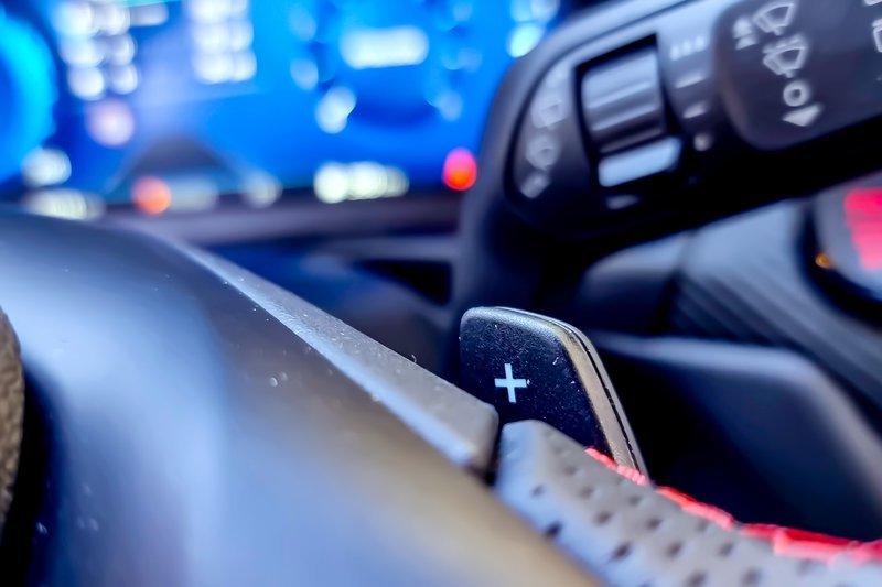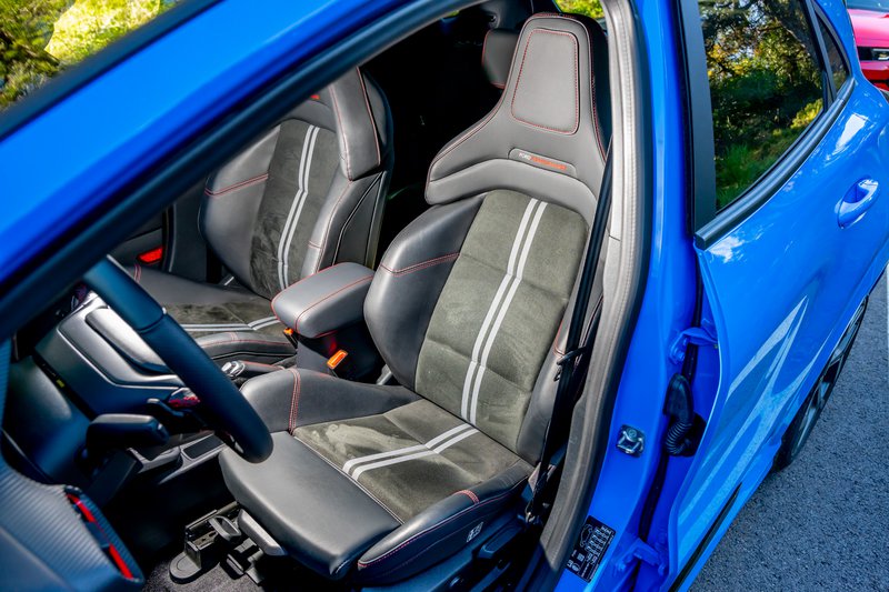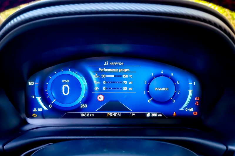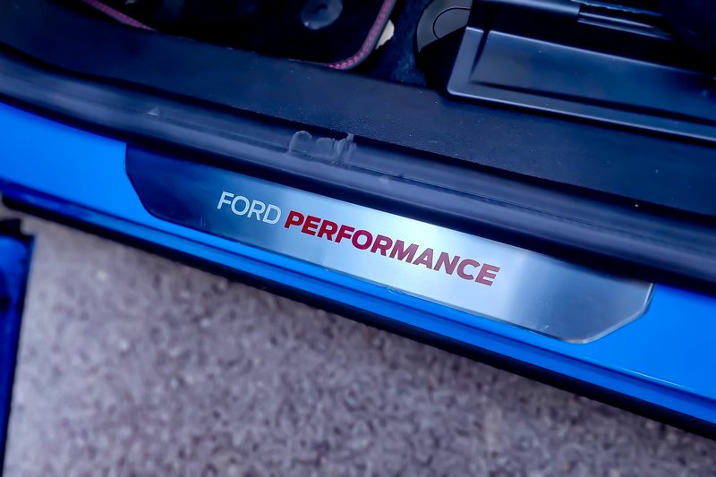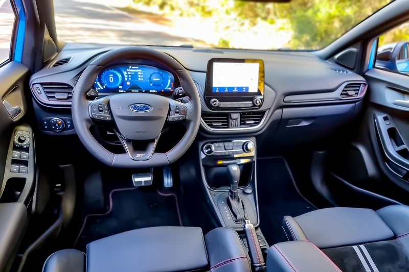 Στο εσωτερικό την παράσταση κλέβουν οι «καθισματάρες» με την υπογραφή της Ford Performance. Η στήριξή τους θα μπορούσε να συγκριθεί μόνο με αγωνιστικές κατασκευές, ενώ παραμένουν ταυτόχρονα άνετα στην πολύωρη οδήγηση. Η επένδυσή τους σε συνδυασμό συνθετικό δέρμα-αλκαντάρα δίνει την απαραίτητη premium αίσθηση που αξίζει στο ST. Την ξεχωριστή εμπειρία συμπληρώνει το τριάκτινο τιμόνι με μπουτόν για την επιλογή οδηγικού προφίλ στη δεξιά πλευρά και ακόμα ένα από το οποίο ο οδηγός επιλέγει κατευθείαν το πρόγραμμα “Sport”. Στην πράξη αποδεικνύεται εξαιρετικά χρήσιμο, μιας και προσφέρει τρομερή αμεσότητα. Για παράδειγμα, πριν βγεις να προσπεράσεις, βάζεις το Sport και στη συνέχεια επανέρχεσαι στο Normal, με δύο αγγίγματα, κάτι που σε άλλη περίπτωση θα αποτελούσε σπαζοκεφαλιά. Από εκεί και πέρα, ο εξοπλισμός άνεσης και ασφάλειας είναι πολύ υψηλός, όπως θα περίμενες σε αυτό το επίπεδο τιμής.