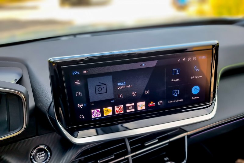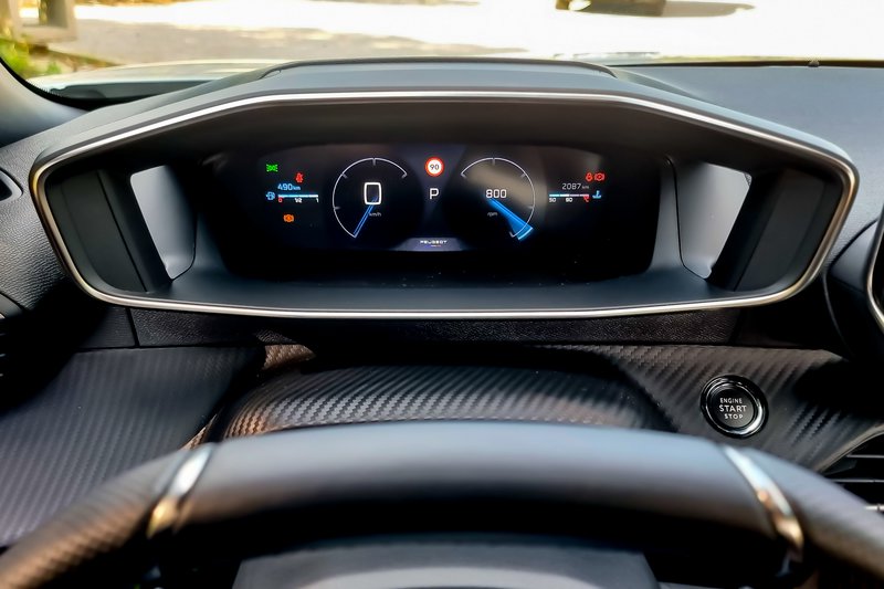 To i-Cockpit με όλα τα κουσούρια του (δεν βλέπεις τα πάντα, αρκεί να χαμηλώσεις το πεπλατυσμένο τιμόνι) έχει 3D υλοποίηση πολύ όμορφη και ουσιώδη, που μαζί με την υπόλοιπη ψηφιακή οθόνη «δένει» σε ένα σύνολο μίνιμαλ απεικόνισης. Δίπλα της και στραμμένη προς τον οδηγό η μεγάλη οθόνη για τα πολυμέσα (δυσκολεύεται λίγο ο συνοδηγός να δει ή να ρυθμίσει στοιχεία των εξελληνισμένων μενού) και πιο κάτω χώροι, χώροι και πάλι χώροι για μικροπράγματα (μέχρι και τύπου αναλόγιο πορτάκι υπάρχει για να ακουμπήσεις το smartphone σου ως τρίτη οθόνη του ταμπλώ υπάρχει).