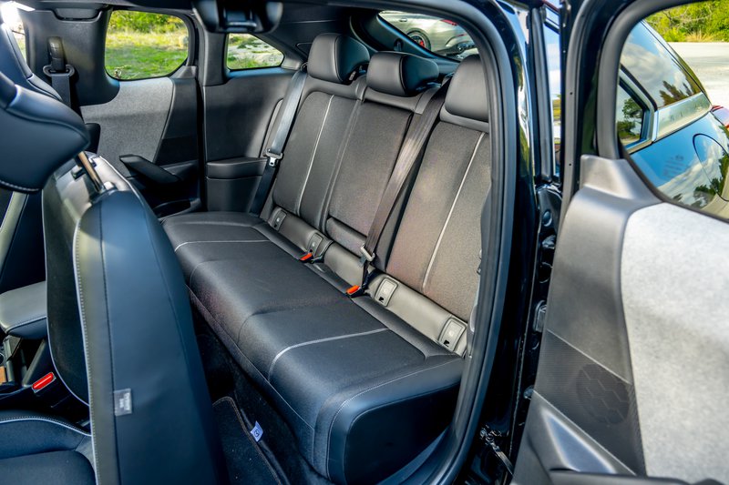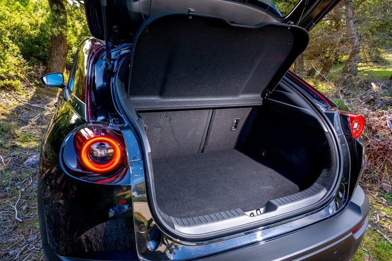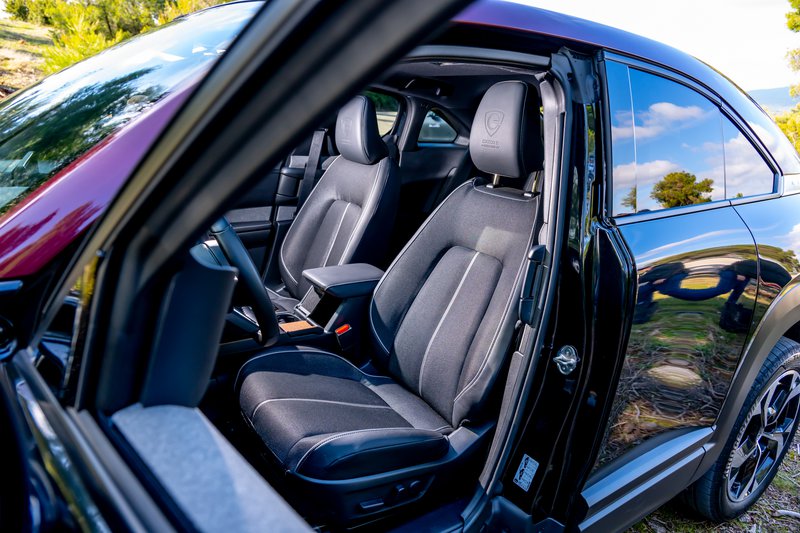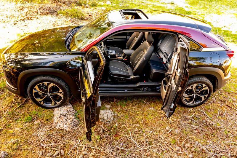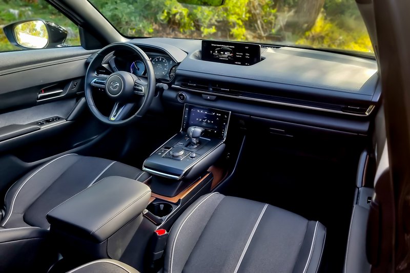 Το εσωτερικό είναι τυπικό Mazda, κομψό και όμορφο με πληθώρα χώρων για μικροαντικείμενα, τρεις οθόνες για τα δέοντα και αρκετά βιώσιμα υλικά. Η εργονομία είναι ιδιότυπη αλλά τουλάχιστον υπάρχουν κάποιοι βασικοί φυσικοί διακόπτες. Οι χώροι για τους πίσω επιβάτες είναι μια κάποια σοβαρή παραχώρηση καθώς οι αντικριστά ανοιγόμενες πόρτες και η έλλειψη μεσαίας κολόνας προσθέτουν στο design αλλά στερούν από την πρακτικότητα και την ευκολία εισόδου πίσω. Πάντως, το πορτμπαγκάζ είναι εξαιρετικό με 350 λίτρα με δεδομένο ότι και μπαταρίες υπάρχουν και κανονικό ρεζερβουάρ.