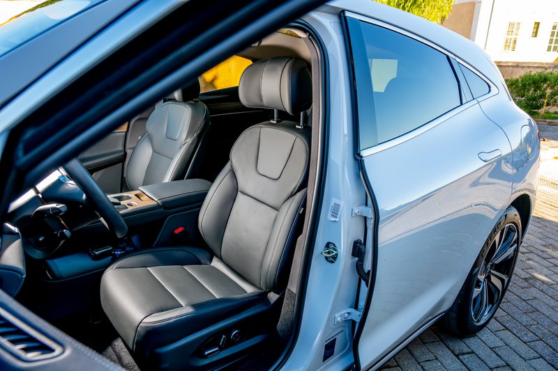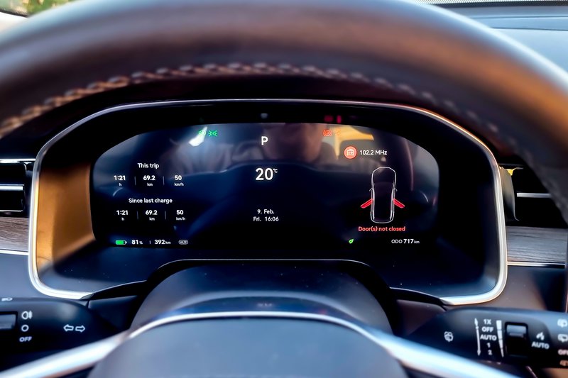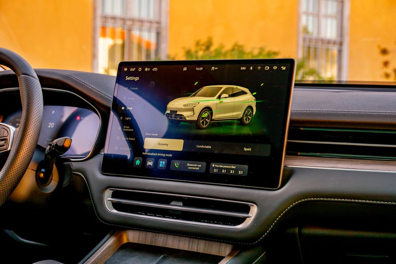 Ενδεχομένως όχι στα ανώτερα στρώματά της, αλλά, εν πάση περιπτώσει, γεγονός είναι ότι έχουμε να κάνουμε και με υψηλή ποιότητα κατασκευής, αλλά και υπερ-πλούσιο high-tech εξοπλισμό που εντυπωσιάζει τον ανυποψίαστο: εδώ, λοιπόν, συναντάς τη σχεδόν παντελή έλλειψη μιας σειράς φυσικών διακοπτών τους οποίους έχει αντικαταστήσει μια τεράσια οθόνη αφής (ένα οριζόντιο τάμπλετ θα λέγαμε) 15,6’’ που θυμίζει ως προσέγγιση αυτό που γνωρίζουμε από τα Tesla. Πρόκειται για επιλογή που έχει και τα πλεονεκτήματά της, αλλά και τις αδυναμίες της – λόγου χάριν: για ρυθμίσεις τον κλιματισμό είσαι υποχρεωμένος να μπεις στο μενού αυτή της οθόνης, κάτι που εν κινήσει δεν είναι τόσο εύκολο (κάποιοι φυσικοί διακόπτες θα έκαναν τα πράγματα από την άποψη της εργονομίας πιο εύκολα). Δεν υπάρχουν καν κάποιοι μοχλοί στις θυρίδες στον αεραγωγών για να ρυθμίσεις την κατεύθυνση του αέρα - ρυθμίζονται όλα μέσα από το μενού της οθόνης με τρόπο αντίστοιχο με αυτόν που γίνεται στα μοντέλα της πρώτης σε πωλήσεις ηλεκτρικών αυτοκινήτων παγκοσμίως? της φοβερής και τρομερής Tesla.