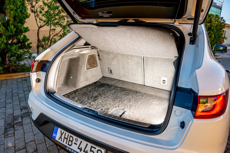 Η επόμενη διαπίστωση που έχουμε να κάνουμε σχετικά με το SERES 5 είναι λιγότερο εντυπωσιακή και έχει να κάνει με τους χώρους, καθώς με δεδομένες τις εξωτερικές διαστάσεις του αυτοκινήτου περιμένεις και βρίσκεις ένα ευρύχωρο εσωτερικό με αρκετό χώρο στο πίσω κάθισμα: δύο δάχτυλα χωρίζουν τα γόνατα ενός ψηλού πίσω επιβάτη από την πλάτη του εμπρός καθίσματος δημιουργώντας έναν αέρα που δεν θα τον χαρακτηρίζαμε σε καμία περίπτωση κορυφαίο, είναι, όμως, παραπάνω από αρκετός, όπως, επίσης, υπάρχει αρκετός αέρας και για το κεφάλι των πίσω επιβατών. Και βάζουμε στο σημείο αυτό έναν αστερίσκο για να πούμε ότι λόγω του κουπέ σχήματος το ύψος που προσφέρει το άνοιγμα της πόρτας για πρόσβαση στο πίσω κάθισμα μικραίνει πολύ. Κατά συνέπεια, ένα ψηλός που θα θελήσει να μπει στο πίσω κάθισμα θα πρέπει οπωσδήποτε να σκύψει…