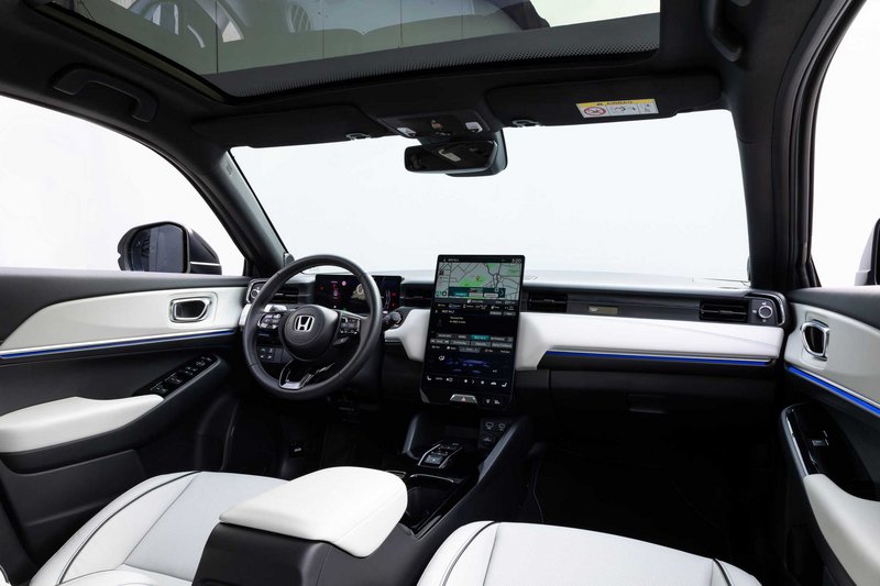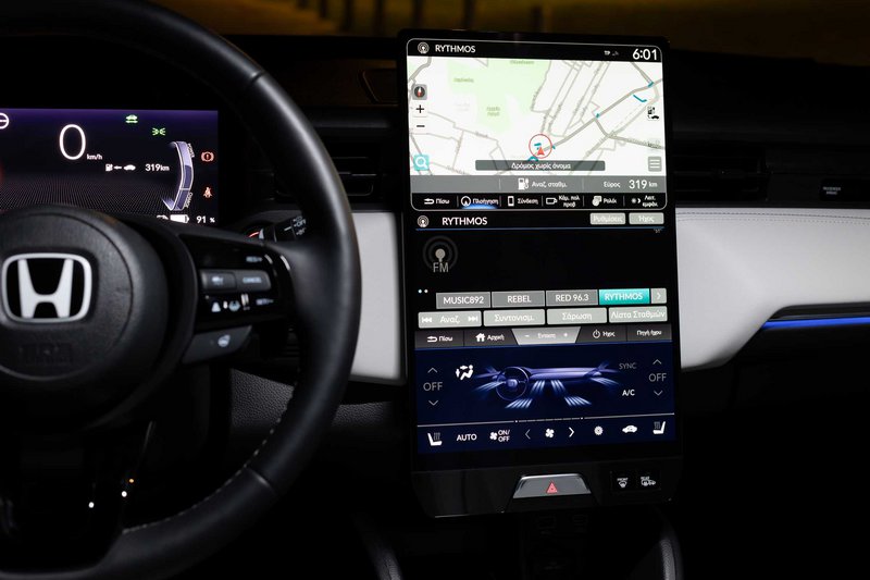 Την ίδια αίσθηση που έχεις βλέποντας το σκαρί του, αποκομίζεις μπαίνοντας στο εσωτερικό του. Υπερυψηλή ποιότητα, ωραίο ταμπλώ, ελάχιστοι φυσικοί διακόπτες και ένα πολυλειτουργικό τιμόνι με μια οθόνη-πίνακα οργάνων που δεν έχει καθόλου αρμονία στην πληθώρα των πληροφοριών που απεικονίζει: ιδού μια συνολική πρώτη αποτίμηση του περιβάλλοντος εργασίας του οδηγού. Εκεί, πάντως, που το νέο αμιγώς ηλεκτρικό μοντέλο της Honda είναι φουτουριστικό και το δείχνει είναι χάρη στη μεγάλη κάθετη οθόνη των 15,1” (!) που βρίθει πληροφοριών χωρισμένων σε τρεις οριζόντιες ζώνες: η επάνω απεικονίζει την πλοήγηση, τις κάμερες τη διασύνδεση με το κινητό μας μέσω CarPlay ή Android Auto, η μεσαία μας βάζει στα μενού των ρυθμίσεων και της διαχείρισης ενέργειας και η τρίτη για διαχείριση του τηλεφώνου, το WiFi και το τηλέφωνο.