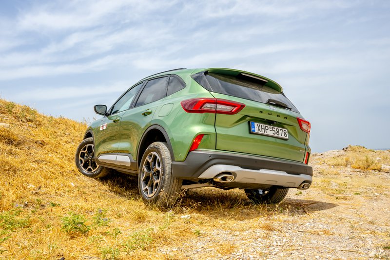 Το ανανεωμένο Ford Kuga έρχεται σε μια εποχή που η μπλε οβάλ παίζει τα ρέστα της στην ηλεκτροκίνηση, δίνοντας, ίσως, την αίσθηση ότι οι υπόλοιπες τεχνολογίες πολύ απλά πηγαίνουν στον… αυτόματο. Μόνο έτσι δεν είναι. Το νέο Kuga, το μεγάλο εξυβριδισμένο SUV δε φείδεται τεχνολογιών, ποιότητας, ικανοτήτων και ίσως το πιο ικανό επίπεδο εξηλεκτρισμένης λειτουργίας. Εν προκειμένω δε, στην έκδοση Active που έχουμε εδώ (και κατά το συνήθειο της Ford) η προσέγγιση συμβαδίζει με τις ικανότητες και την ονομασία, όχι μόνο λόγω μιλιτέρ απόχρωσης αλλά και λόγω πρόσθετων ενθέτων (με έξτρα ποδιές και τροποποιημένο προφυλακτήρα), αυξημένου ύψους αμαξώματος από το έδαφος κατά 10 mm και 5 mm εμπρός και πίσω αντίστοιχα με συνολικά 191 mm να χωρίζουν το πάτωμα από το έδαφος για κίνηση σε εκτός δρόμου διαδρομές.