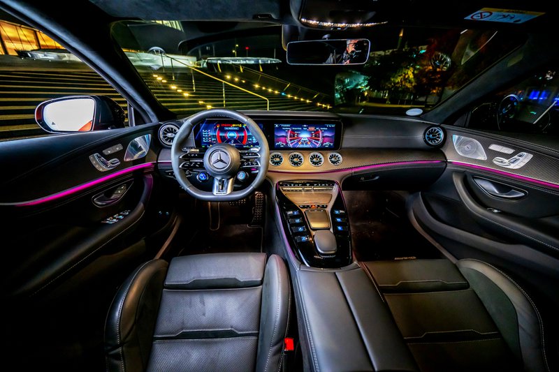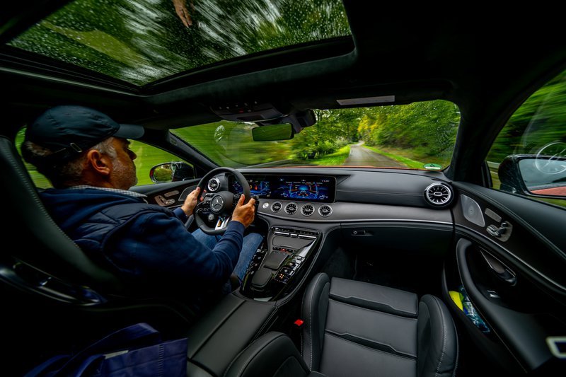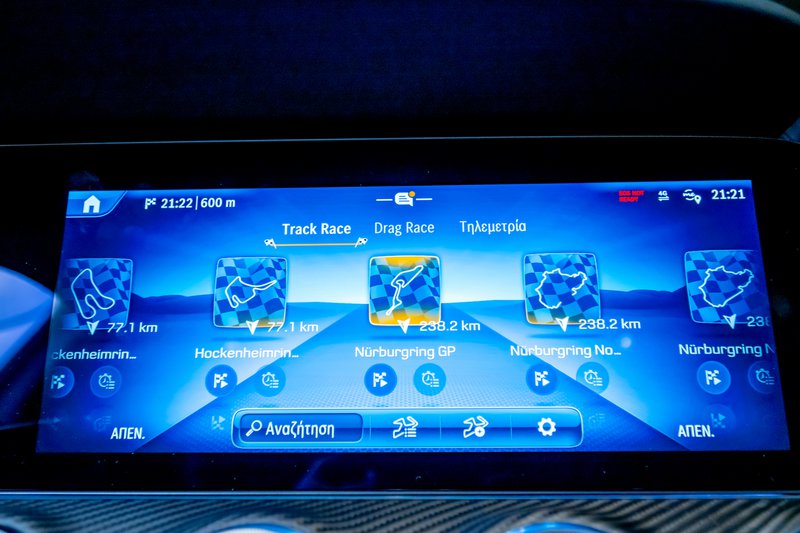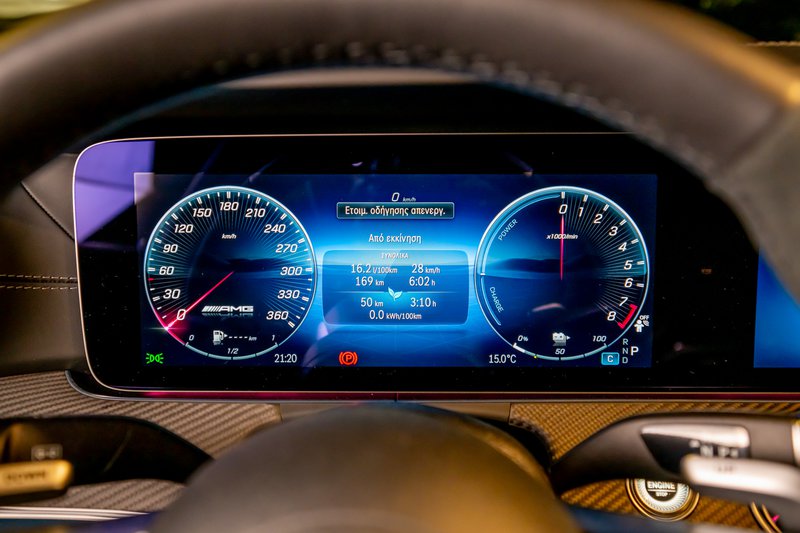 Κι αφού κάναμε τις συστάσεις, ανοίξαμε τις χωρίς πλαίσιο θύρες και είδαμε την τεχνολογία, την παράδοση και την πολυτέλεια να έρχονται σε αποχρώσεις γκρι και μαύρες τού μότορσπορ για τέσσερις επιβάτες και με τον πιλότο να κάθεται κανονικά, όχι στο επίπεδο του... κρασπέδου, να βάζει τα χέρια του σε ένα τιμόνι με σουέντ δέρμα και να ξεχειλίζουν εμπρός του οθόνες στα ελληνικά και μαύρη λάκα και ανθρακόνημα και διακόπτες στο τιμόνι για να ρυθμίσει τα χρειώδη, τα AMG Dynamics και τις αναρτήσεις ή το πρόγραμμα του κινητήρα. Όρεξη για οδήγηση να έχεις και δρόμο ανοιχτό εμπρός σου.