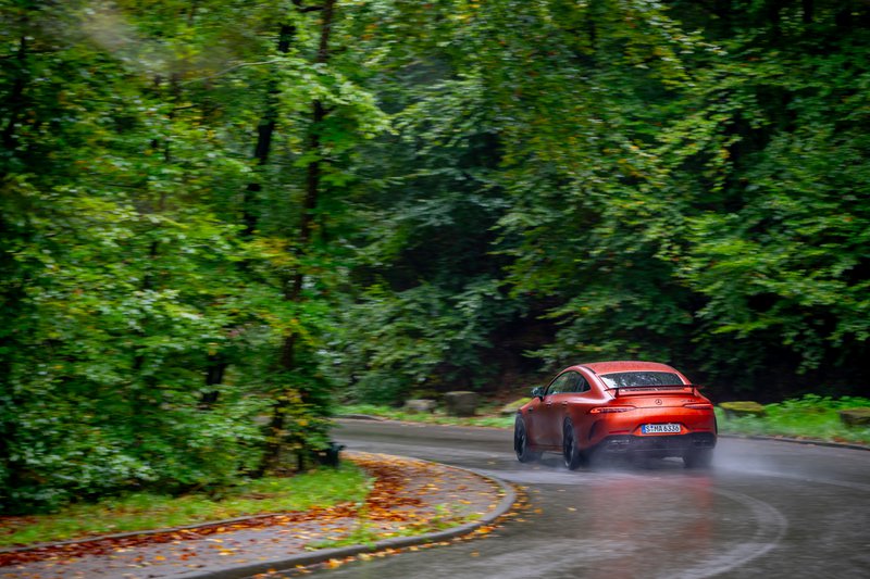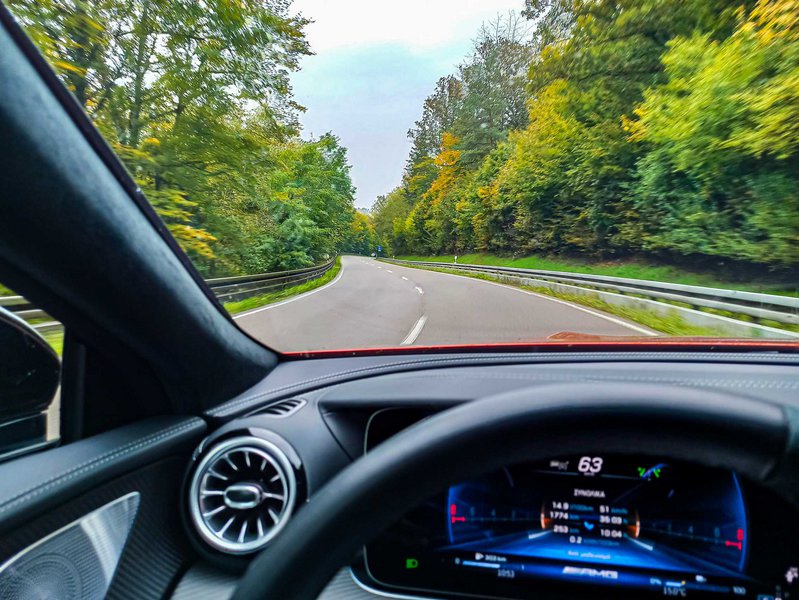Κι ήρθε η πρώτη ημέρα, βροχερή, μουντή με ουρανό μολύβι, αλλά διάθεση μέσα στην καμπίνα γεμάτη να σπρώξει το γκρι και να δώσει τη θέση του στο πορτοκαλί της AMG που, με τη φροντίδα της Manufaktur, ήταν σαν να έλαμπε στην καταπράσινη εξοχή της Στουτγάρδης. Κι αρχίσαμε να ρέουμε στις ασφάλτινες καμπές μέσα στο δάσος. Και όπου μπορούσαμε να δίνουμε κάτι από την ψυχή του, και τη δική μας μαζί. Αλλά κάτι μοναδικό γινόταν εδώ: μια τέλεια συμφωνία στη διάθεση.