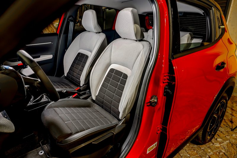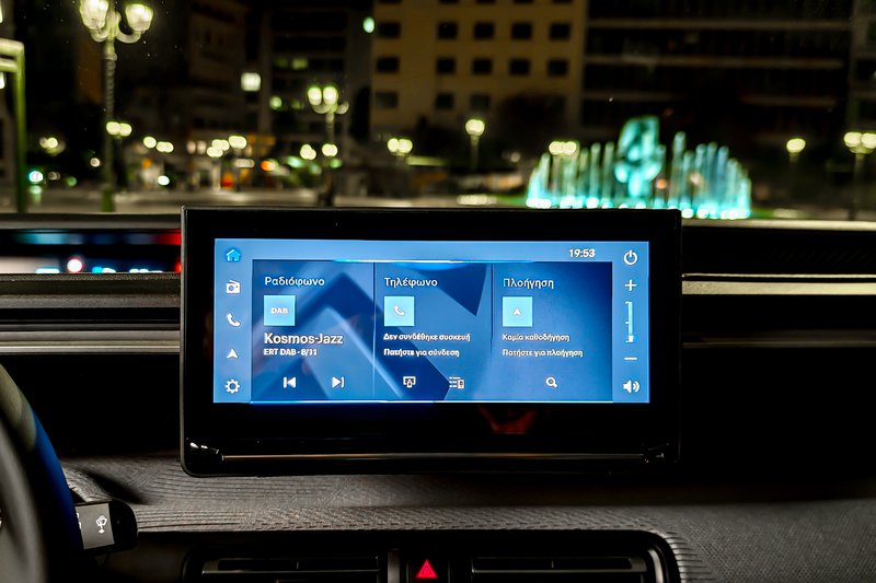 Είναι εντός όσο χρειάζεσαι ευρύχωρο και φωτεινό για να μην νιώθεις πληκτικά, καθόσον και μεγάλα κρύσταλλα υπάρχουν και τετράγωνη η καμπίνα είναι με την απόσταση για τα γόνατα των πίσω επιβατών να είναι πλέον η κορυφαία στην κατηγορία, χάρη και στο μεταξόνιο των 2.540 mm, αλλά και στο τραβηγμένο προς τα εμπρός ταμπλώ, που είναι θαρρείς φτιαγμένο με δύο οριζόντιες μονοκοντυλιές. Ξεχωρίζουμε εδώ το μικρό flat top/bottom πολυλειτουργικό τιμόνι με την παχιά στεφάνη, τα δύο ράφια για να ακουμπήσεις πολλά πράγματα και τον νέο καινοτόμο πίνακα οργάνων που δεν είναι τίποτε άλλο παρά μια μαύρη κάθετη λωρίδα στην οποία προβάλλονται από την οθόνη που είναι τοποθετημένη οριζόντια στο ταμπλώ οι ενδείξεις που περιμένει ο οδηγός. Τα συστήματα ασφαλείας που μπορείς να απενεργοποιήσεις (Ηχητική προειδοποίηση Traffic Sign Recognition και Lane Departure Warning) βρίσκονται σε διακόπτες αριστερά του τιμονιού, ενώ ο κλιματισμός σε άλλη συστοιχία διακοπτών στη βάση της κονσόλας. Εκεί θα βρείτε χώρο για το κινητό σας και την ασύρματη φόρτισή του, δύο ποτηροθήκες και τον 6άρη επιλογέα που έχει πολύ θετική αίσθηση και στιβαρό κούμπωμα. Το περιβάλλον διασύνδεσης είναι ιδιότυπο: Η βασική εξοπλιστική έκδοση «You» διατίθεται με μια… σπαρτιάτικη «ντρίμπλα», καθόσον υπάρχει βάση μόνο για κινητό που μέσω app και NFC μετατρέπει το smartphone μας σε κεντρική οθόνη αφής και πάροχο πολυμέσων και πλοήγησης. Στην έκδοση Max δοκιμής μας, όμως, τα πράγματα είναι πιο… κιμπάρικα, αφού υπάρχει μια χορταστική, μακρόστενη οθόνη αφής 10,25” η οποία αναλαμβάνει τα –βασικά– δέοντα για πολυμέσα, τηλέφωνο και πλοήγηση σε άπταιστα ελληνικά.