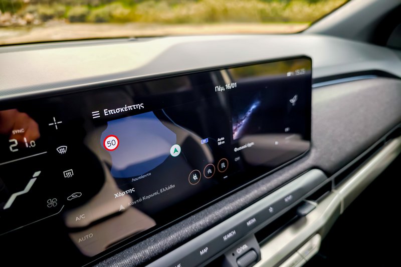 Διότι μπαίνοντας στο εσωτερικό βλέπεις πράγματα που αμέσως σε αγκαλιάζουν με φιλική διάθεση. Εξηγούμαστε. Δείτε το φαρδύ ρηχό ταμπλώ με τη μακριά και στενή οθόνη που απαρτίζεται από δύο μεγάλες 12,3” και μία ακόμα ενδιάμεσα στις 5,3” για τη διαχείριση του κλιματισμού. Και μετά το υποβραχιόνιο με τραπεζάκι, τους μαλακούς στρογγυλεμένους απτικούς διακόπτες, την ωραία υφή των πλαστικών και μπόλικων βιώσιμων υλικών, αλλά και το πανέμορφο GT-Line, πολυλειτουργικό, τριάκτινο τιμόνι. Υπάρχει μια ανοιχτοσύνη εδώ, ένα ευρύ οπτικό πεδίο, με πόρτες που ανοίγουν διάπλατα, παράθυρα μεγάλα και αίσθηση ότι κάθεσαι σε ένα μεγαλύτερο αυτοκίνητο. Και, μεταξύ μας, με μεταξόνιο 2,68 m και εντελώς επίπεδο πάτωμα, η καμπίνα είναι εξίσου μεγάλη με το μεγαλύτερο σε διαστάσεις Kia Sportage. Να αναφέρουμε και τις ευκολίες και τις ανέσεις;