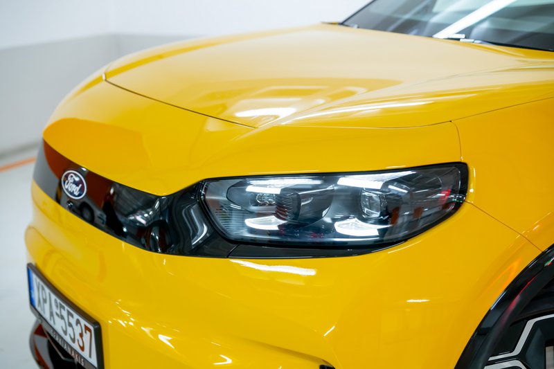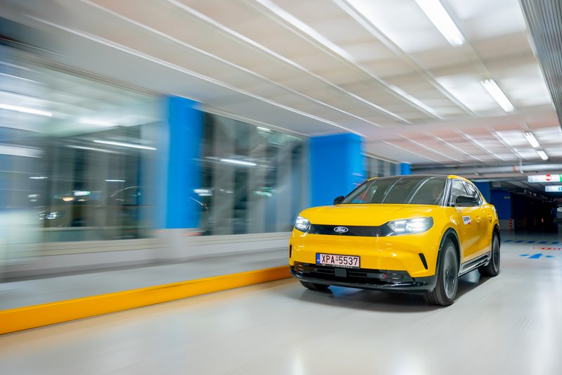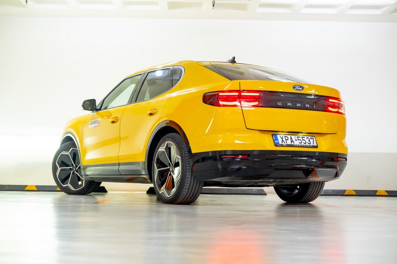 Όπως ίσως έχετε καταλάβει από τον τίτλο, το αυτοκίνητο της δοκιμής μας είναι η κορυφαία τετρακίνητη έκδοση, με 340 PS, τελική ταχύτητα 180 km/h και εντυπωσιακές επιταχύνσεις με 0-100 km/h σε μόλις 5,3 sec. Κάτω από τις λαμαρίνες βρίσκονται δύο ηλεκτροκινητήρες –ένας σε κάθε άξονα– και ανάμεσά τους μια μπαταρία με χωρητικότητα 79 kWh. Πρόκειται για την κορυφαία έκδοση στην γκάμα του Capri, μιας και υπάρχουν ακόμα δύο εκδόσεις με την κίνηση πίσω πιο προσιτές και με μικρότερες ιπποδυνάμεις. Δεν θα εμβαθύνουμε στα τεχνικά ιδιαίτερα, μιας και αυτό το κομμάτι θα διαβάσετε στο Tech Facts, όμως αξίζει να τονίσουμε πως το αυτοκίνητο βασίζεται στην πλατφόρμα ΜΕΒ του Group VW. Ωστόσο, έχει γίνει αρκετή δουλειά, ώστε το Capri να έχει οδηγικό χαρακτήρα Ford.