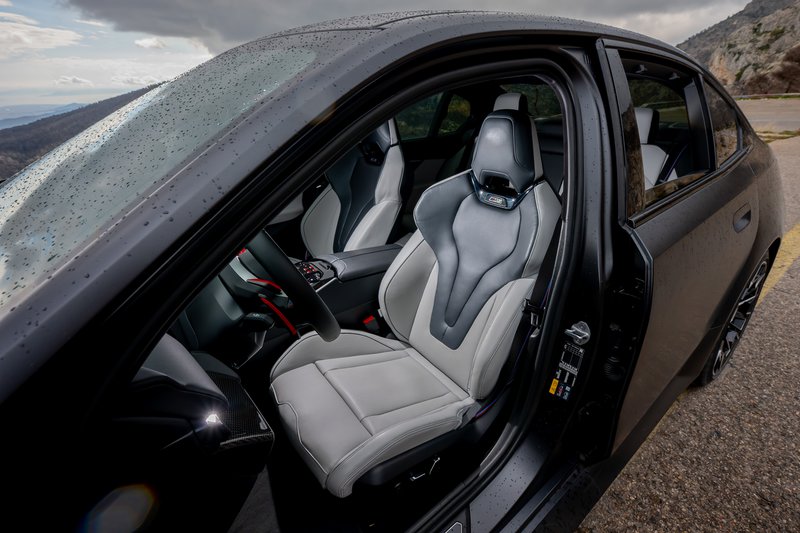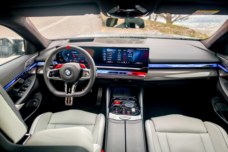 Η M5 στο εσωτερικό της συνίσταται πάντοτε σε έναν ιδανικό συνδυασμό υψηλής πολυτέλειας εμπλουτισμένη με σπορ στοιχεία ουσίας και υψηλή τεχνολογία και η νέα γενιά παραμένει πιστή. Ό,τι αγγίζεις έχει άριστη ποιότητα, συναρμογή και φινίρισμα, ενώ μεγάλες ή μικρές λεπτομέρειες σου ανεβάζουν τη διάθεση. Πάρτε, για παράδειγμα, τα υπέροχα από κάθε άποψη καθίσματα. Έχουν εξαιρετική στήριξη, είναι φαρδιά, ώστε να μη στριμώχνεσαι, και, βέβαια, είναι θερμαινόμενα και ρυθμιζόμενα σε κάθε δυνατή κατεύθυνση. Το δέρμα καλής ποιότητας κυριαρχεί, ενώ στις λίγες επιφάνειες όπου υπάρχουν πλαστικά είναι εφάμιλλης αισθητικής. Στο επάνω μέρος του ταμπλώ πρωταγωνιστεί η κυρτή οθόνη BMW Curved Display, στην οποία, όπως και στο στάνταρ BMW Head-Up Display, προβάλλεται περιεχόμενο ειδικό για μοντέλα M. Παρά το γεγονός πως είναι εύκολη στη χρήση, θα θέλαμε οι ρυθμίσεις του κλιματισμού να βρίσκονται εκτός οθόνης. Ένα νέας σχεδίασης δερμάτινο τιμόνι M με επίπεδο κάτω τμήμα, παχιά στεφάνη και φωτιζόμενα πλήκτρα M θα κάνει ιδανική παρέα στα χέρια του οδηγού. Μαζί και τα δύο κόκκινα μπουτόν Μ1 και Μ2 στο επάνω μέρος του τιμονιού.