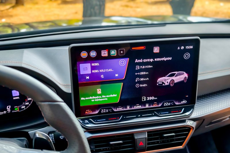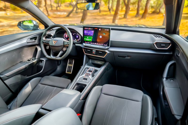 Αν κοιτώντας το ανανεωμένο Formentor από έξω διαπιστώνεις ότι η μεγάλη αλλαγή αφορά στη μάσκα, στο εσωτερικό το πρώτο που σου τραβάει την προσοχή είναι η νέα, μεγάλη (12,9 ΄΄) οθόνη αφής/πολυμέσων που σηματοδοτεί και την τεχνολογική αναβάθμιση του μοντέλου (ελέω και του νέου κανονισμού γενικής ασφάλειας GSR II). Η νέα αυτή οθόνη (που είδαμε πρόσφατα με παραλλαγές σε Tiguan και Kodiaq) συγκεντρώνει ουκ ολίγες πολλές λειτουργίες, ενσωματώνοντας στη βάση της και τα χειριστήρια αφής τού συστήματος κλιματισμού, τα οποία, παρά το γεγονός ότι λειτουργούν αισθητά καλύτερα σε σχέση με ό,τι είχαμε δει όταν πρωτοέκαναν την εμφάνισή τους σε διάφορα μοντέλα του VW Group, εξακολουθούν να μην μπορούν να ανταγωνιστούν τα φυσικά χειριστήρια σε πρακτικότητα.