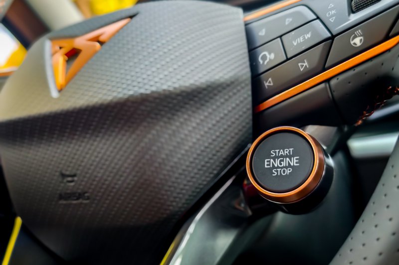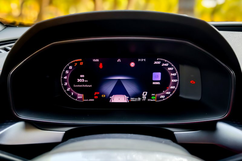 Το τιμόνι με το μεγάλο σήμα της Cupra στο κέντρο του φροντίζει να σου δίνει με την αισθητική του και τη λειτουργική του διαμόρφωση το στίγμα τού Formentor. Εκτός από τα συνήθη χειριστήρια για το ηχοσύστημα και τα διάφορα άλλα βοηθήματα, ο οδηγός έχει στη διάθεσή του και δύο μπουτόν: ένα για την εκκίνηση του κινητήρα (start/stop) και ένα με το σήμα της Cupra για την επιλογή λειτουργίας του αυτοκινήτου, μεταξύ των τριών διαθέσιμων modes (Comfort, Performance και Individual – με το τελευταίο να παραμετροποιείται από τον οδηγό).