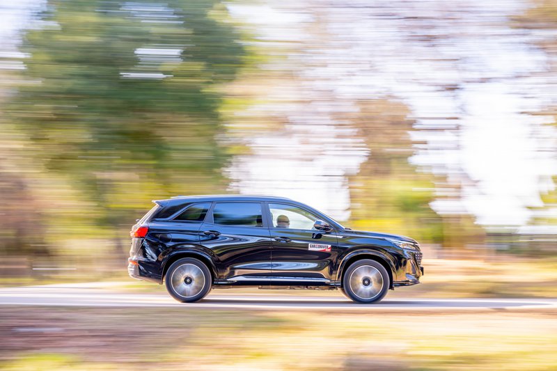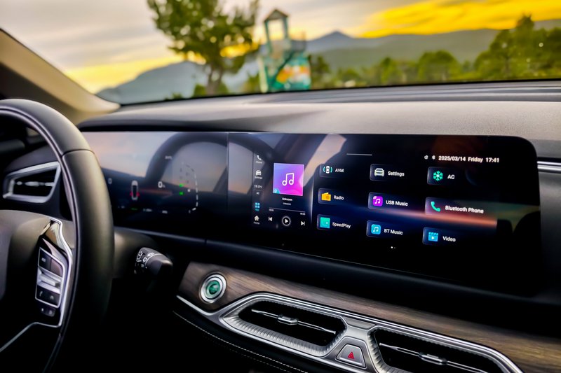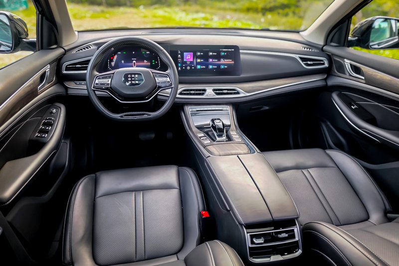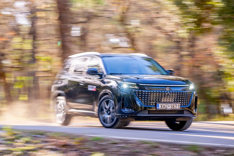 Στο εσωτερικό, το μεγάλο μεταξόνιο (2,78 m) συμβάλλει καθοριστικά στο να προσφέρει το E5 άνετους χώρους για τους επτά επιβάτες, από τους οποίους δεν αφήνει κανέναν παραπονεμένο. Ο ψηφιακός πίνακας οργάνων των 7’’ και η κεντρική οθόνη αφής Multimedia 12,3’’ παρέχουν όλες τις πληροφορίες και ψυχαγωγικές επιλογές που χρειάζεται ο οδηγός και οι επιβαίνοντες, με επιλογές συνδεσιμότητας, όπως Android/Car Play, διευκολύνοντας τη χρήση των λειτουργιών του αυτοκινήτου. Επίσης, η ποιότητα των υλικών είναι ικανοποιητική, κάτι που προσθέτει έναν τόνο πολυτέλειας. Το διαπιστώνει κανείς εύκολα αυτό αγγίζοντας τα απλωμένα παντού μαλακά υλικά στο ταμπλώ και τον διάκοσμο, όπου εύκολα μπορεί να εντοπίσει και την ποιότητα της συναρμογής τους.