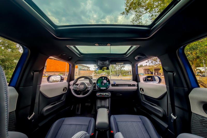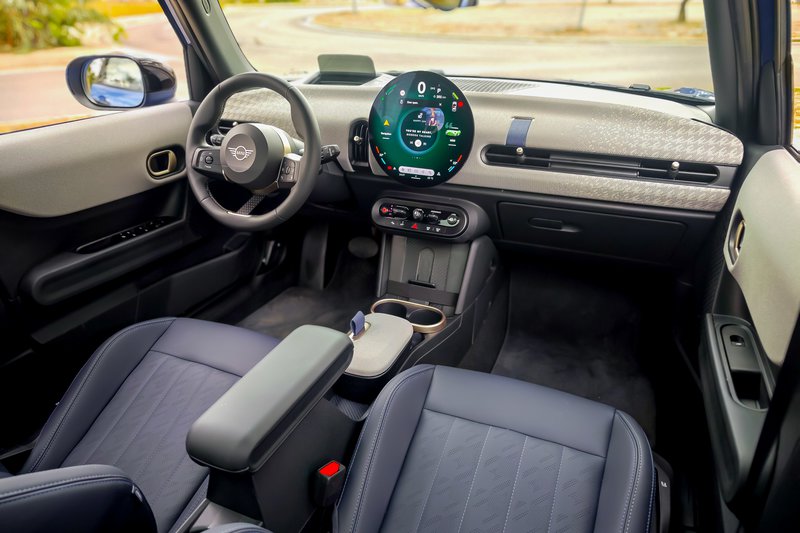 Η καμπίνα είναι χωρίς αμφιβολία εντυπωσιακή. Η νέα OLED οθόνη 9,5 ιντσών στο κέντρο, με το κυκλικό της σχήμα, προσδίδει έναν φουτουριστικό αέρα. Το λειτουργικό MINI OS 9 είναι καλοσχεδιασμένο, με θεματικά modes που επηρεάζουν τόσο τα γραφικά όσο και την ατμόσφαιρα στο εσωτερικό. Η ποιότητα υλικών είναι καλή και η αίσθηση «casual premium» διατρέχει κάθε εκατοστό της καμπίνας.