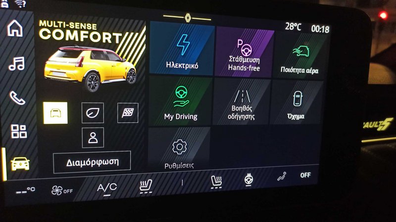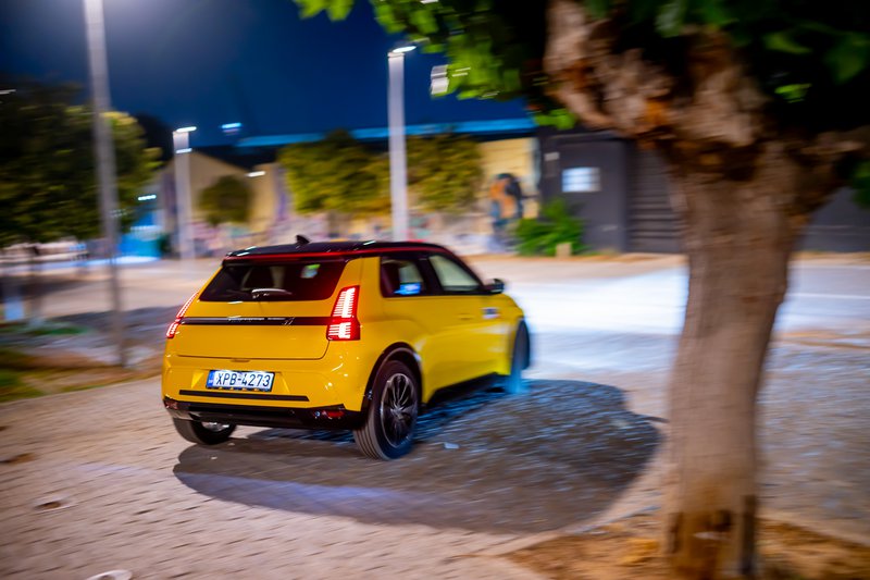 Στις ιδιαιτερότητες των ελληνικών δρόμων, το Renault 5 προσαρμόζεται ιδανικά. Η ανάρτηση απορροφά αποτελεσματικά τις ανωμαλίες, το πλαίσιο είναι καλοστημένο, ενώ το χαμηλό για EV βάρος (1.449 kg) και η άμεση απόκριση στο δεξί πεντάλ προσφέρουν σβελτάδα στις καθημερινές μετακινήσεις. Σε αυτοκινητόδρομο θα κινηθεί με σταθερότητα, πολύ ήσυχα και με νορμάλ κατανάλωση… ηλεκτρονίων. Ωστόσο, ο διασκεδαστικός του χαρακτήρας θα ξεδιπλωθεί σε μια επαρχιακή διαδρομή, όπου η γεωμετρία της ανάρτησης, το ιδανικά ζυγισμένο πλαίσιο και το πολύ καλό σε πληροφόρηση τιμόνι (2,6 στροφές) προσφέρουν ακρίβεια στους χειρισμούς και αμεσότητα στις εντολές του οδηγού. Η γενική αίσθηση που προσφέρει είναι ότι οδηγείς ένα θερμικό αυτοκίνητο, καθώς το R5 δεν προσφέρει την αποστειρωμένη αίσθηση των περισσότερων ηλεκτρικών. Είναι πολύ ευχάριστο, η ανάρτηση είναι ενδοτική, ενώ και στο στροφιλίκι προσφέρει έναν fun-to-drive χαρακτήρα που δεν συναντάς σε ένα EV, με τη βοήθεια μιας τετράδας Continental EcoContact 6Q διαστάσεων 195/55-R18. Μόνο υπό πίεση και στο απότομο φρενάρισμα (σ.σ. πολύ αποδοτικά τα φρένα του και χωρίς κόπωση, ακόμα και σε πίεση), εμφανίζει εμπροσθοβαρείς τάσεις, αποτέλεσμα του όλα… μπροστά: κινητήρας, σύστημα ψύξης μπαταρίας. Ένα ακόμα σημαντικό προσόν του νέου Renault 5 είναι και η τιμολογιακή του τοποθέτηση στην ελληνική αγορά. Οι διαθέσιμες εκδόσεις ξεκινούν με την Evolution 120 (40 kWh/120 PS) και τιμή στα 26.900 €, ενώ η ισχυρότερη Techno 150 (52 kWh/150 PS) φτάνει στα 32.900 € και η κορυφαία Icon του αυτοκινήτου δοκιμής στα 34.900 € (σ.σ. οι στις τιμές αυτές δεν περιλαμβάνεται καμία επιδότηση/έκπτωση).