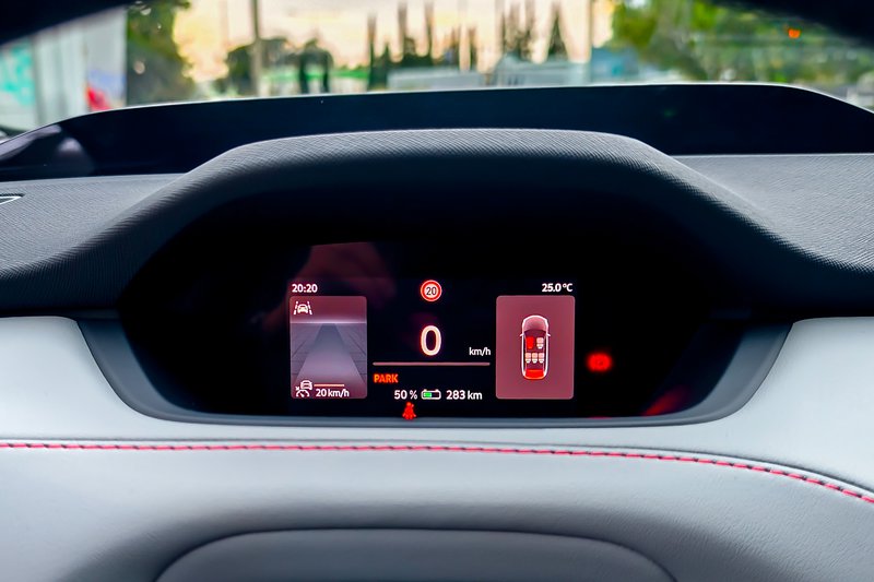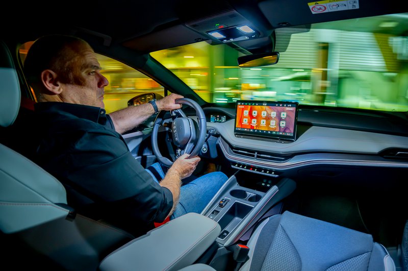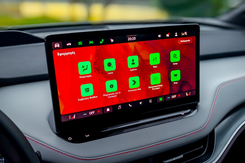 Δυστυχώς, δεν υπάρχει περιστροφικός επιλογέας ήχου παρά μόνο το γνωστό slider στη βάση οθόνης για το εξαιρετικό ηχοσύστημα της Canton. Τα μενού είναι ελληνικά και ευανάγνωστα, γρήγορα στις επιλογές, αν και με αρκετά υπομενού. Εμπρός από το πολυλειτουργικό, δίμπρατσο τιμόνι θα βρει κανείς την κλασική μικρή οθόνη με τα βασικά δεδομένα του Group, αλλά ως μπόνους στο αυτοκίνητό «μας» είχαμε head-up display επαυξημένης πραγματικότητας που μπορεί να απεικονίσει ταχύτητα, σήματα κυκλοφορίας, cruise control, πληροφορίες του συστήματος υποβοήθησης οδηγού, καθώς και οδηγίες πλοήγησης. Επιπλέον, η επαυξημένη πραγματικότητα προβάλλει πληροφορίες με κινούμενα γραφικά, όπως δυναμικά βέλη πλοήγησης, δείκτες προορισμού και δυναμικά βοηθήματα οδήγησης.