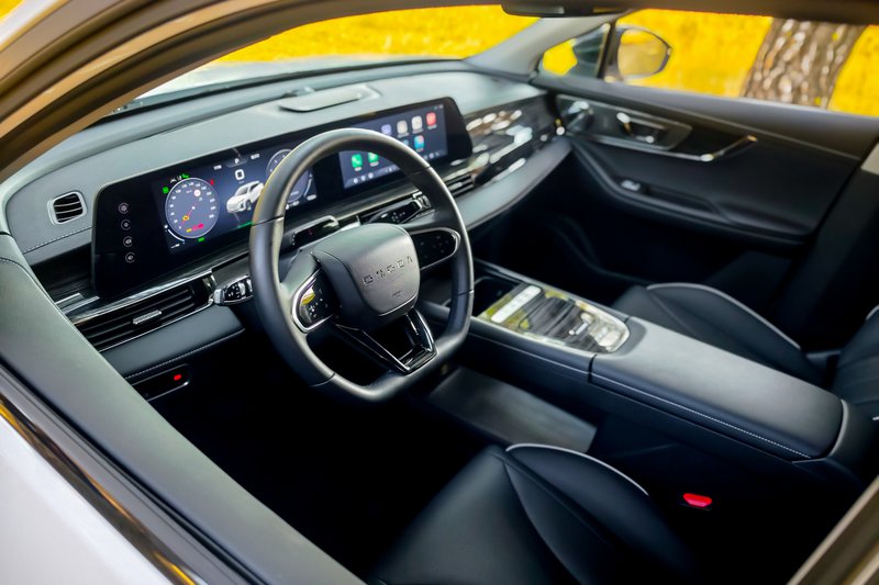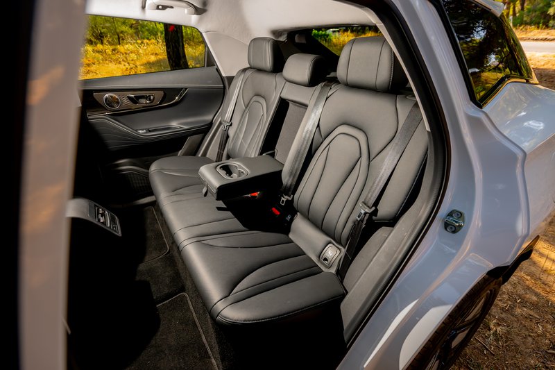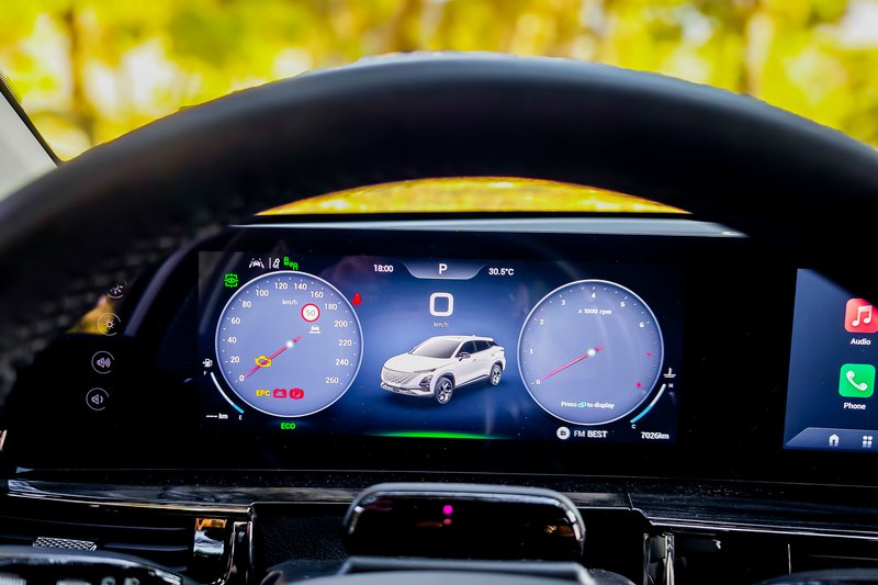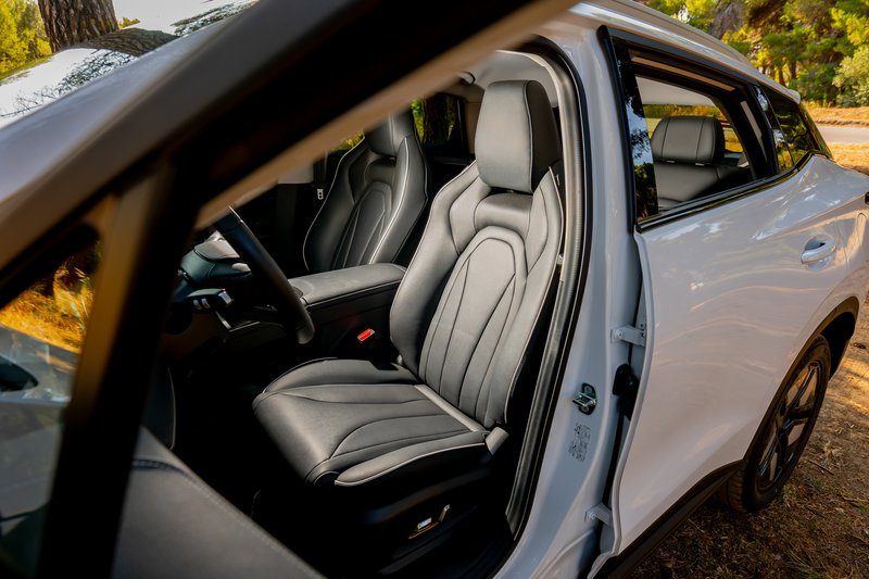 Η φιλοσοφία σχεδίασης που θέλει πολυτέλεια και τεχνολογία δεν περιορίζεται στο εξωτερικό: στο εσωτερικό, κυριαρχεί το minimal high-tech ύφος, με διπλή κυρτή οθόνη 12,3” και ambient φωτισμό 64 αποχρώσεων που αγκαλιάζει το ταμπλώ και τις πόρτες, δημιουργώντας ένα μοντέρνο ψηφιακό cockpit. Οι άφθονες μαλακές επενδύσεις και οι ματ μεταλλικές λεπτομέρειες, δίνουν στο μάτι την αίσθηση της ποιότητας, ενώ δεν λείπουν οι ανέσεις: θερμαινόμενα και αεριζόμενα εμπρός καθίσματα, head-up display και ασύρματη φόρτιση smartphone 50W είναι μερικά από αυτά, όπως και τα όμορφα καθίσματα που αγκαλιάζουν καλά οδηγό και συνοδηγό. Η δε τεχνολογική φαρέτρα του Omoda 5 είναι εντυπωσιακή. Το σύστημα υποβοήθησης οδήγησης ADAS ενσωματώνει περισσότερες από 20 λειτουργίες ασφαλείας: ACC (Adaptive Cruise Control), AEB (Αυτόνομο Φρενάρισμα Έκτακτης Ανάγκης), 540° κάμερα (δεν κάνουμε λάθος, απεικονίζει και κατά τον κατακόρυφο άξονα), αναγνώριση σημάτων κυκλοφορίας και διατήρηση λωρίδας. Οι χώροι είναι επαρκείς με δεδομένη την κατηγορία στην οποία εντάσσεται το Omoda 5 και μόνον το οπτικό πεδίο του οδηγού προς τα πίσω, απόρροια της σχεδίασης της οροφής, είναι περιορισμένο.