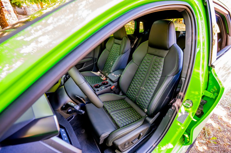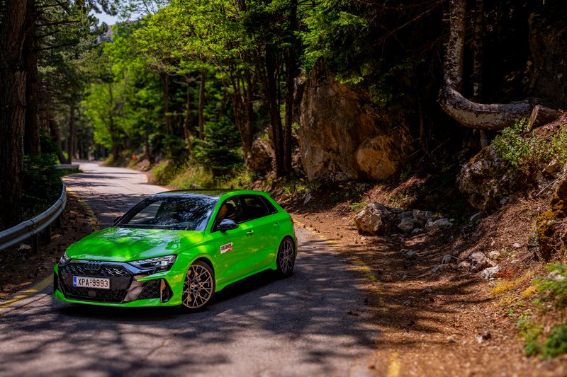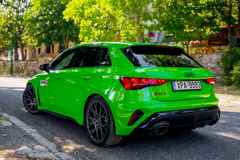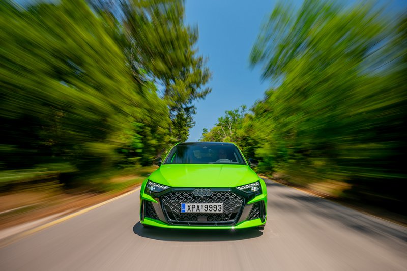 To VW group έχει φανατικό κοινό στην Ελλάδα και αυτό το διαπιστώνεις από πρώτο χέρι οδηγώντας το RS3. Μαγνητίζει τα βλέμματα σε κάθε του πέρασμα. Βοήθησε, βέβαια, στο αυτοκίνητο δοκιμής μας η πράσινη εξωτερική απόχρωση που ονομάζεται Kyalami. Ξεχειλίζει από εξωστρέφεια και είναι φορές που μας έλειψε μια πιο διακριτική απόχρωση σύννομη με το γενικότερο-διακριτικό-πνεύμα της Audi, αλλά και αυτό που επιβάλλει η εποχή που ζούμε. Από την άλλη, με αυτή την απόχρωση φαίνονται οι ωραίες γραμμές του αμαξώματος και τα υπέροχα φουσκωμένα φτερά. Στο μπροστινό μέρος, κυριαρχεί η χαρακτηριστική μάσκα Singleframe, που είναι πιο χαμηλή και πιο φαρδιά σε σχέση με το παρελθόν. Ξεχωρίζουν, επίσης, οι νέοι προβολείς τεχνολογίας LED Matrix που περιλαμβάνουν 24 φωτιστικά στοιχεία που σχηματίζουν ένα μοτίβο καρώ σημαίας. Στο πίσω μέρος ο μεγάλος διαχύτης περιλαμβάνει δύο μεγάλες οβάλ απολήξεις και έναν χαρακτηριστικό κόκκινο ανακλαστήρα στο κέντρο. Όπως και στους προβολείς, έτσι και τα πίσω φωτιστικά σώματα έχουν μια νέα γραφική σχεδίαση που αποτελεί ένα ακόμα στοιχείο διαφοροποίησης.