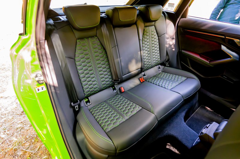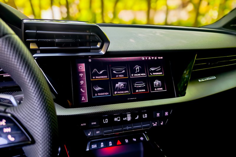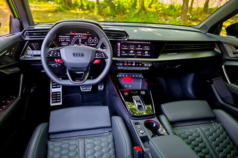 Το εσωτερικό αποτελεί μια βελτίωση της εικόνας που είχαμε από τα RS3 στο παρελθόν. Αυτό σημαίνει υψηλή ποιότητα υλικών και συναρμολόγησης, κορυφαία τεχνολογία συνδεσιμότητας και απεικόνισης και συνολικά ένα περιβάλλον που σε φτιάχνει να ζεις. Κτισμένο γύρω από τον οδηγό θυμίζει πιλοτήριο αεροπλάνου. Δείτε, για παράδειγμα, τους αεραγωγούς για τον οδηγό που βρίσκονται εκατέρωθεν του Audi virtual cockpit plus. Το τελευταίο έχει διαγώνιο 12,3” και βρίθει χρήσιμων ενδείξεων. Πάντως, οπτικά θα προτιμούσαμε μια εικόνα με λιγότερα επίπεδα στο ταμπλώ. Εκτιμήσαμε το γεγονός πως υπάρχουν φυσικοί διακόπτες και ειδικά για τον κλιματισμό, στοιχείο που παραλείπουν πολλές εταιρείες στις μέρες μας. Τα καθίσματα έχουν καλή πλευρική στήριξη, ενώ οι επενδύσεις είναι (όπως πάντα) πολύ ποιοτικές και με μεγάλη προσοχή στη λεπτομέρεια. Οι χώροι για επιβάτες είναι λογικοί, ωστόσο ο χώρος για τις αποσκευές είναι μικρός, με 282 L.