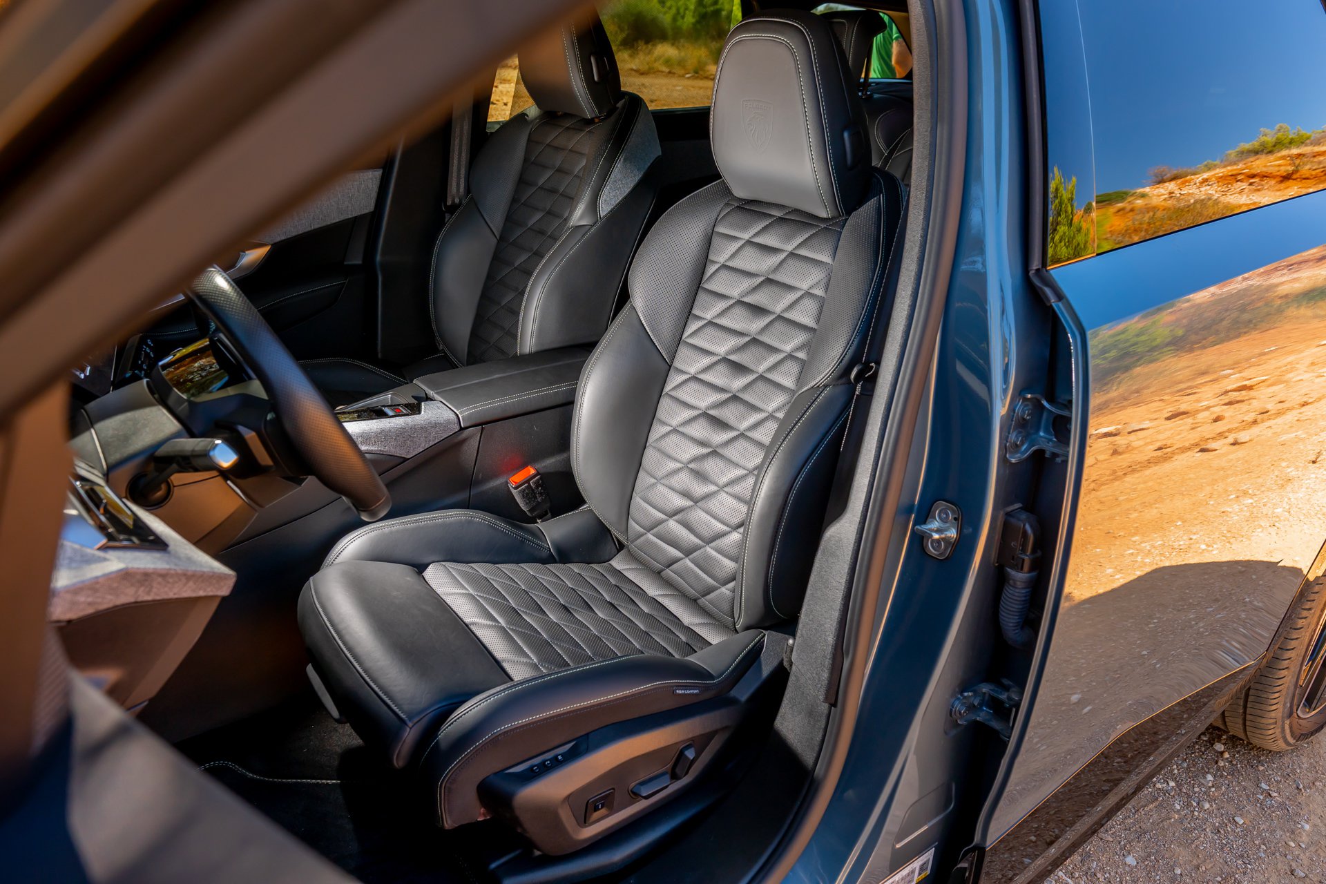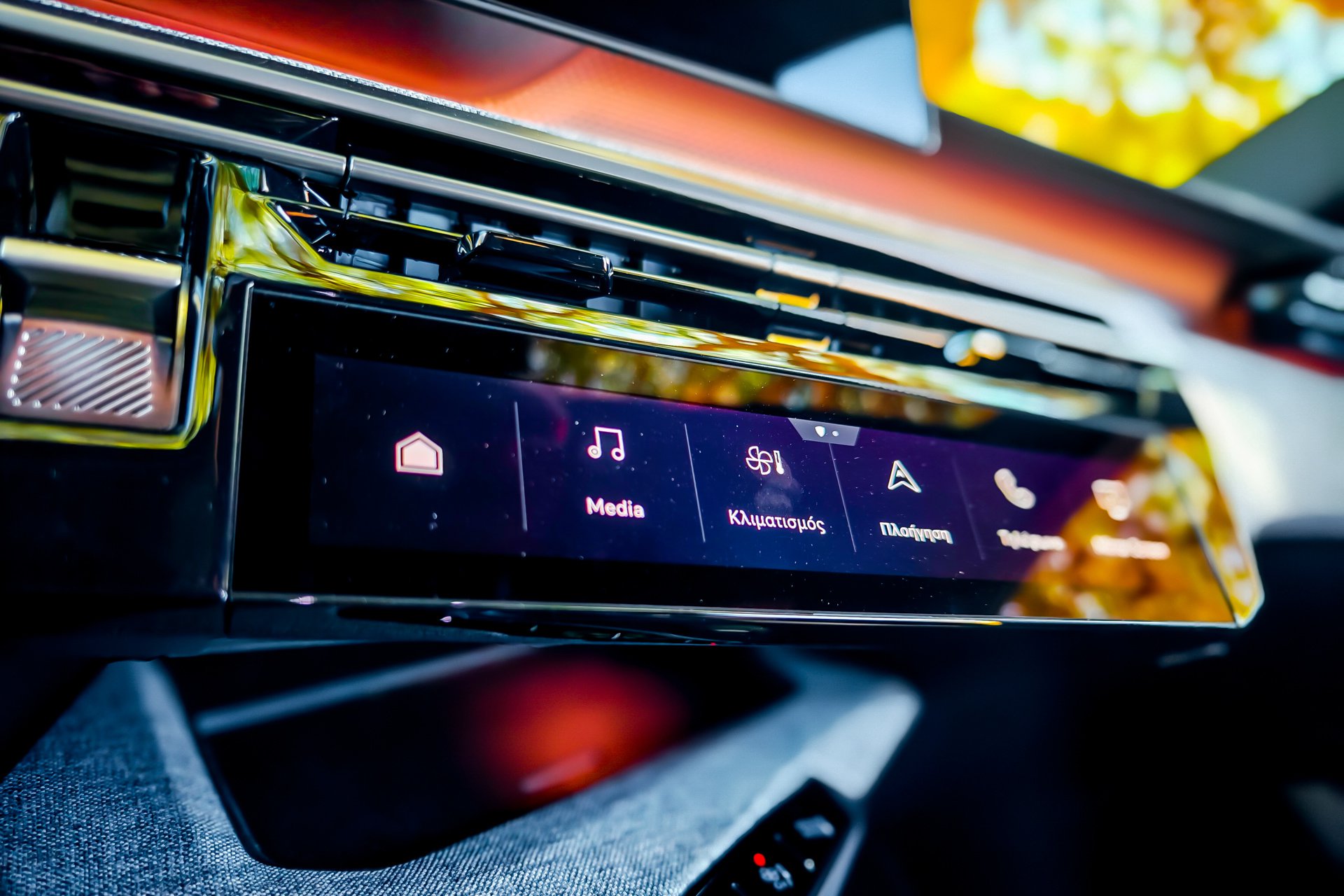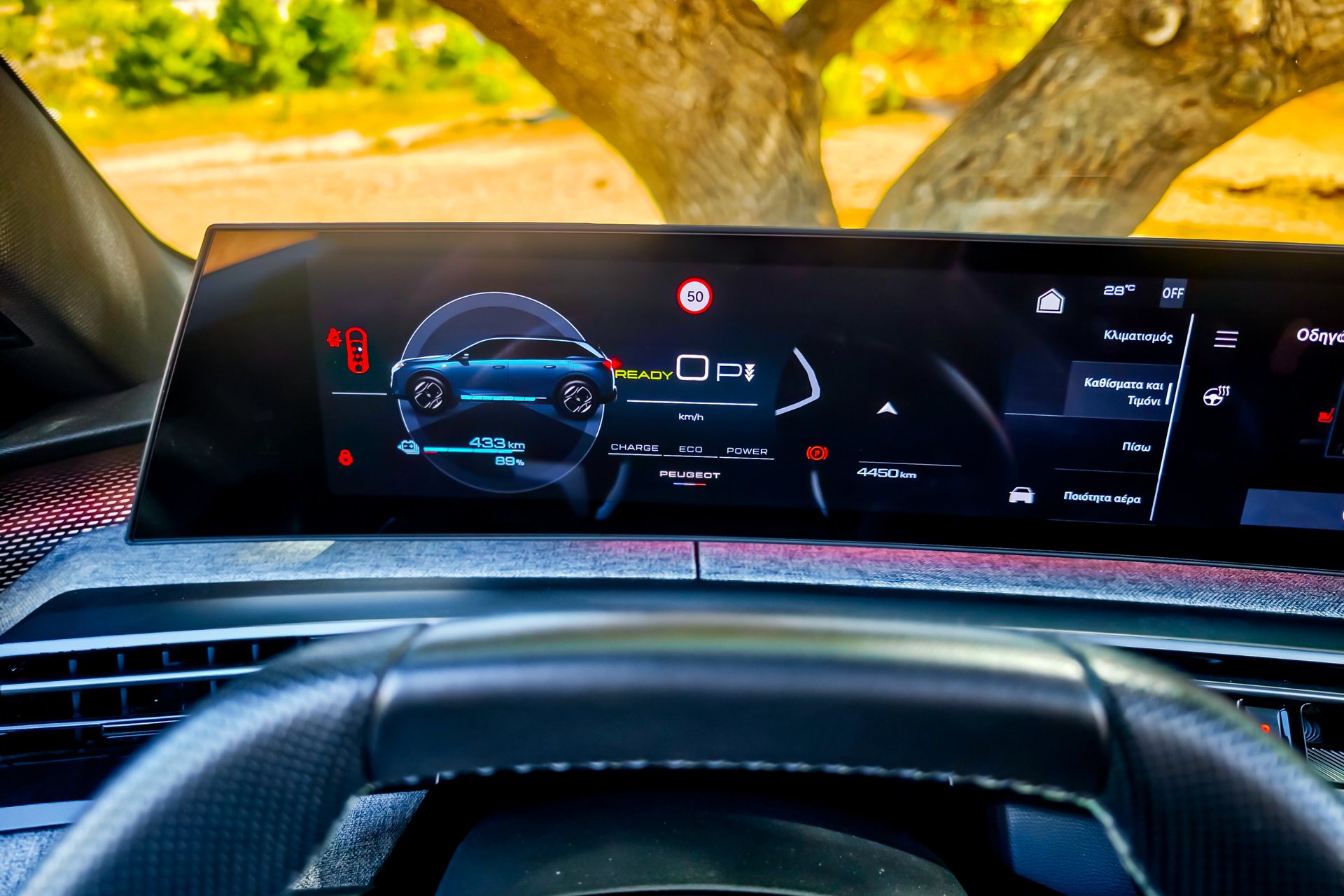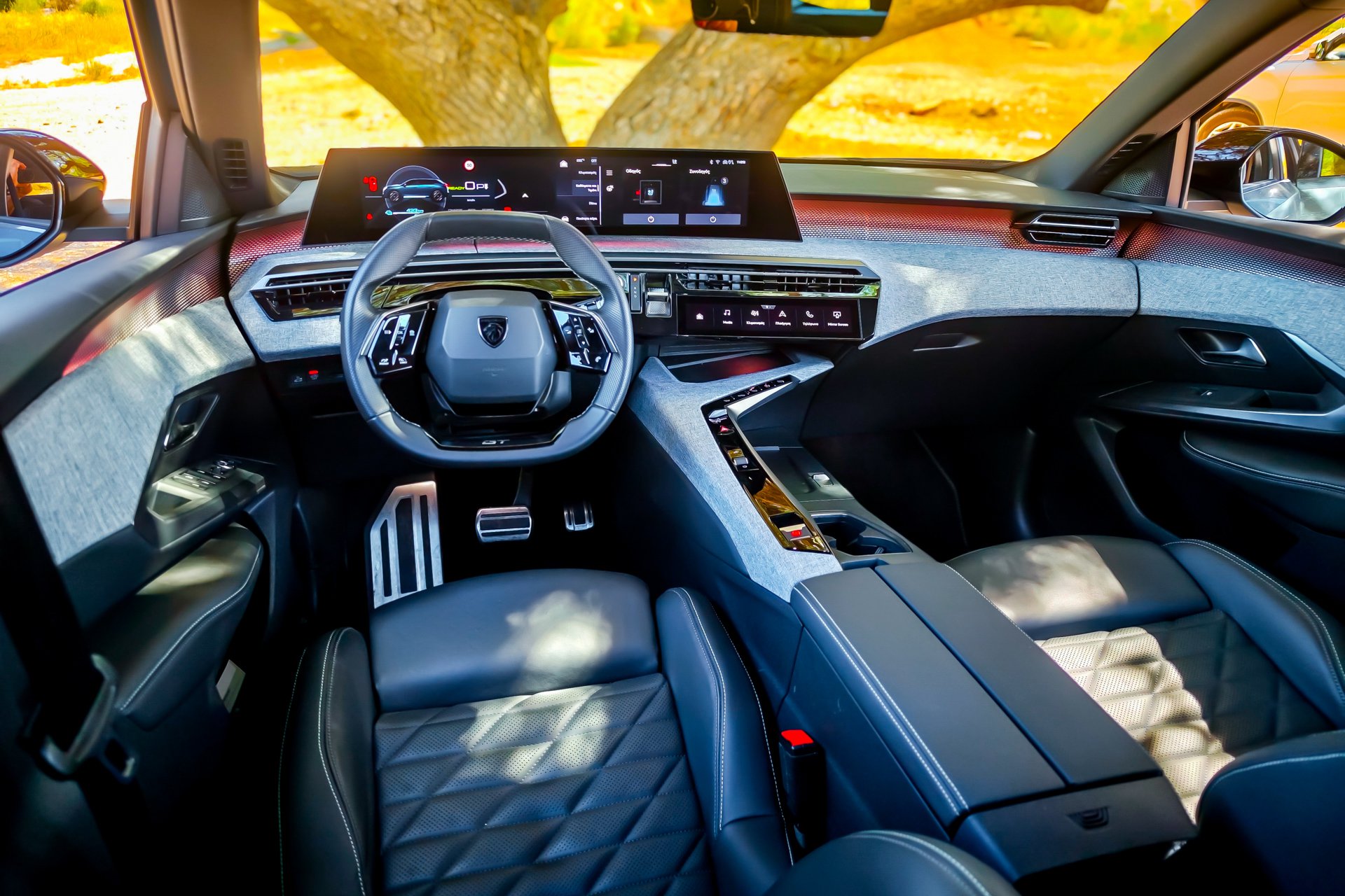 Στην καμπίνα, το πραγματικά αιωρούμενο Panoramic i-Cockpit με την ενιαία οθόνη των 21” (συντίθεται από δύο οθόνες, τη μία δίπλα στην άλλη) σε βάζει αμέσως στο κλίμα, όπως και τα πλήκτρα αφής i-Toggles για εύκολη πρόσβαση σε μια πλειάδα λειτουργιών του αυτοκινήτου. Ο σχεδιασμός είναι μοντέρνος, η ποιότητα υλικών top με μπόλικα μαλακά πλαστικά, βιώσιμα υφάσματα και μεταμοντέρνες αλουμινένιες επιφάνειες (χάρμα ιδέσθαι το βράδυ) και τα όμορφα καθίσματα σε Alcantara και δέρμα, θερμαινόμενα και αεριζόμενα είναι άνετα κρατώντας μια χαρά το σώμα και φροντίζουν να νιώθεις ότι βρίσκεσαι σε κάτι ανώτερο.