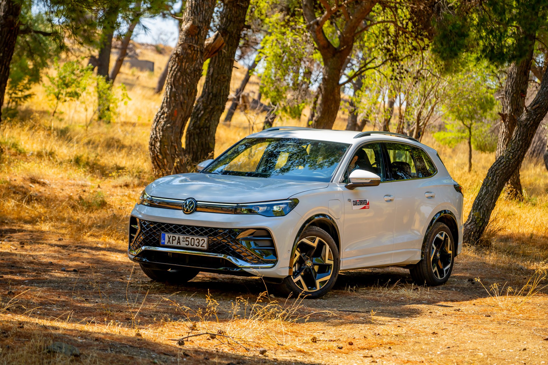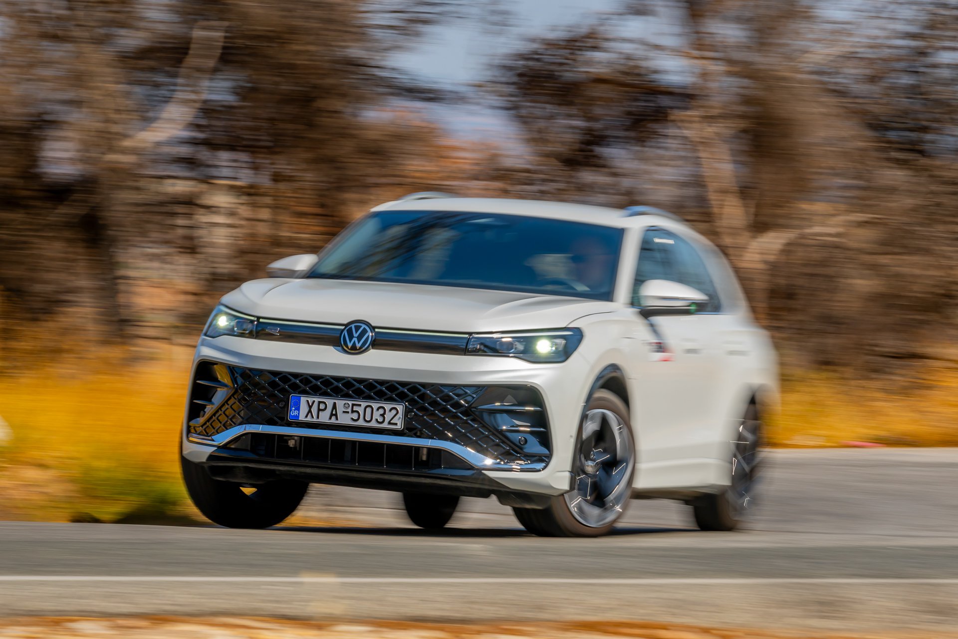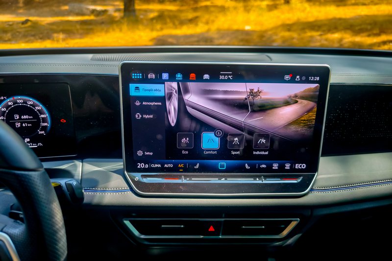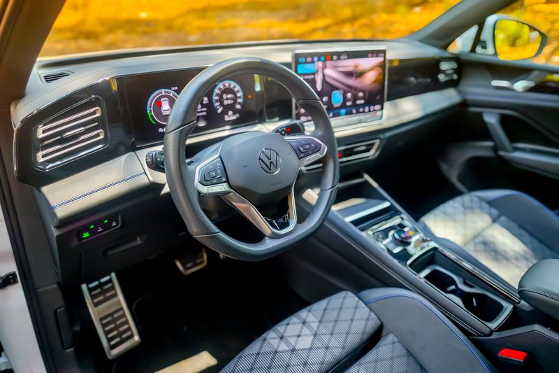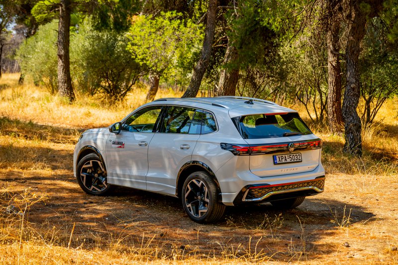 Στο εσωτερικό, η αίσθηση παραμένει δωρική, αλλά με πολλή προίκα εναρμονισμένη με τον χαρακτήρα του αυτοκινήτου: sport comfort καθίσματα ergoActive με λειτουργία μασάζ, ambient φωτισμός 30 χρωμάτων και κορυφαία υλικά δίνουν μια αύρα πολυτέλειας που συνδυάζεται με την πρακτικότητα ενός SUV με ευρύχωρη καμπίνα και την ανάλογη προσαρμοστικότητα, μιας και τα πίσω καθίσματα κινούνται σε ράγιες. Εννοείται ότι λόγω του plug-in τής υλοποίησης ο χώρος αποσκευών είναι ρηχός. Η δε τεχνολογία αποτελεί έναν από τους βασικούς άξονες του Tiguan με το Digital Cockpit Pro με οθόνη 12,9” και το εξελιγμένο σύστημα infotainment MIB4, σε συνδυασμό με τον ψηφιακό φωνητικό βοηθό IDA να προσφέρουν εμπειρία επιπέδου premium κατηγορίας (και για άλλη μία φορά «κρύα» ανέκδοτα γιατί, ναι, και τέτοια λέει!). Το σύστημα υποστηρίζει ακόμα και ChatGPT, ενώ εννοείται ότι στο πεδίο της ασφάλειας και της υποβοήθησης το Tiguan eHybrid R-Line εξοπλίζεται με πλήρες πακέτο συστημάτων της Volkswagen, όπως Adaptive Cruise Control, Side Assist, Front Assist και το νέο Park Assist με λειτουργία μνήμης, που θυμάται έως και πέντε διαφορετικούς ελιγμούς στάθμευσης.