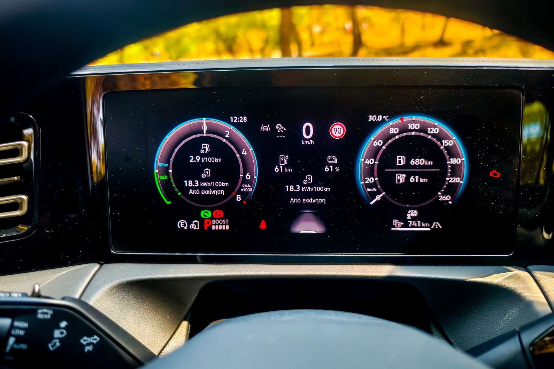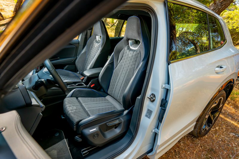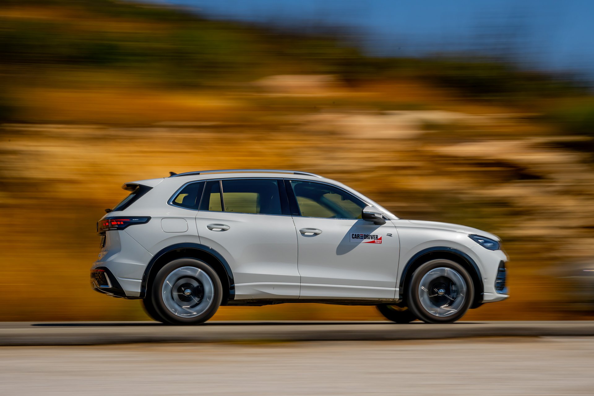 Στο εσωτερικό, η αίσθηση παραμένει δωρική, αλλά με πολλή προίκα εναρμονισμένη με τον χαρακτήρα του αυτοκινήτου: sport comfort καθίσματα ergoActive με λειτουργία μασάζ, ambient φωτισμός 30 χρωμάτων και κορυφαία υλικά δίνουν μια αύρα πολυτέλειας που συνδυάζεται με την πρακτικότητα ενός SUV με ευρύχωρη καμπίνα και την ανάλογη προσαρμοστικότητα, μιας και τα πίσω καθίσματα κινούνται σε ράγιες. Εννοείται ότι λόγω του plug-in τής υλοποίησης ο χώρος αποσκευών είναι ρηχός. Η δε τεχνολογία αποτελεί έναν από τους βασικούς άξονες του Tiguan με το Digital Cockpit Pro με οθόνη 12,9” και το εξελιγμένο σύστημα infotainment MIB4, σε συνδυασμό με τον ψηφιακό φωνητικό βοηθό IDA να προσφέρουν εμπειρία επιπέδου premium κατηγορίας (και για άλλη μία φορά «κρύα» ανέκδοτα γιατί, ναι, και τέτοια λέει!). Το σύστημα υποστηρίζει ακόμα και ChatGPT, ενώ εννοείται ότι στο πεδίο της ασφάλειας και της υποβοήθησης το Tiguan eHybrid R-Line εξοπλίζεται με πλήρες πακέτο συστημάτων της Volkswagen, όπως Adaptive Cruise Control, Side Assist, Front Assist και το νέο Park Assist με λειτουργία μνήμης, που θυμάται έως και πέντε διαφορετικούς ελιγμούς στάθμευσης.