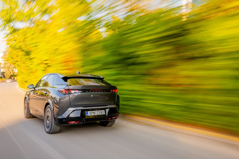 Σε αυτοκινητόδρομο τούτο το Peugeot ταξιδεύει σταθερά έχοντας μπόλικη ηχομόνωση, παχιά κρύσταλλα έναν εξαιρετικά χαμηλό αεροδυναμικό συντελεστή (Cx: 0,28) και, άρα, χαμηλό θόρυβο εντός της καμπίνας και εντυπωσιακή -για τα δεδομένα της μάζας του- άνεση. Εννοείται ότι υπάρχουν τα… τεμπέλικα συστήματα όπως adaptive cruise control με λειτουργία stop-and-go που σε κρατά ξεκούραστο με το δεξί σου πόδι και σε απόσταση ασφαλείας από τον προπορευόμενό σου. H αναγεννητική πέδηση έχει τρεις βαθμίδες μέσω paddles στο τιμόνι, οπότε μπορείς να το ρυθμίσεις ανάλογα, από «σχεδόν ελεύθερο ρολάρισμα» μέχρι “one pedal driving” (και εννοείται ότι προτιμούμε το δεύτερο σενάριο, αποταμιεύοντας και το τελευταίο… ηλεκτρόνιο ρεύματος). Όπως και να έχει πάντως, η κατανάλωση στην πράξη και με απαλό πόδι, με μικτές συνθήκες, κυμαίνεται γύρω στις 19,0 kWh/100 km, οπότε μια πραγματική αυτονομία 400+ km είναι ρεαλιστική.